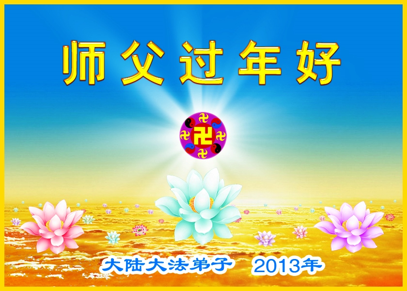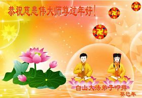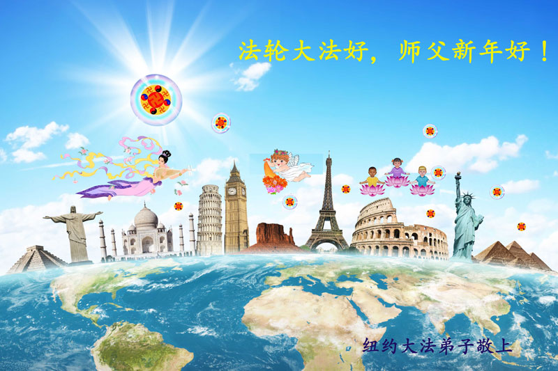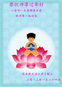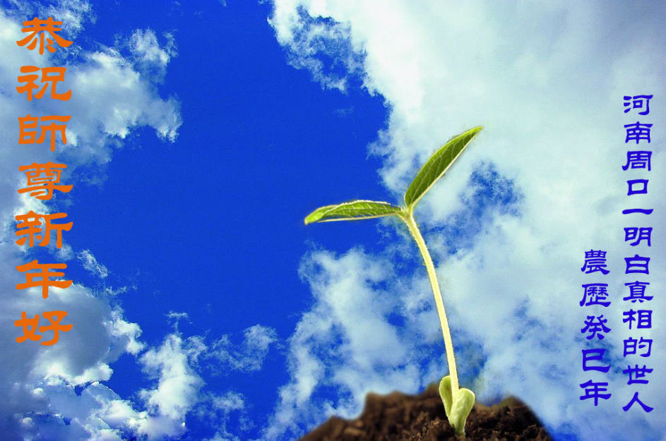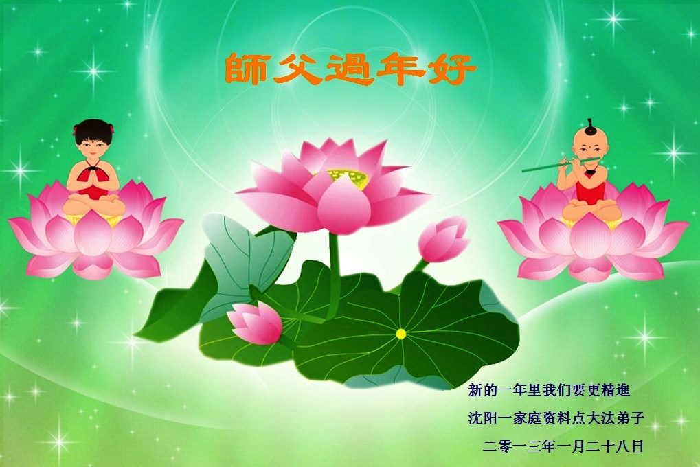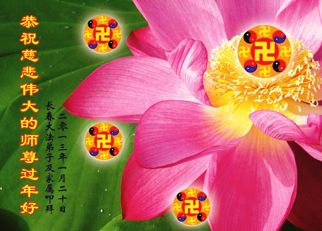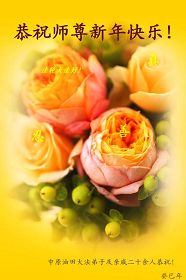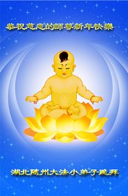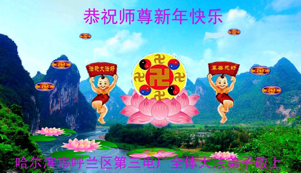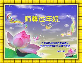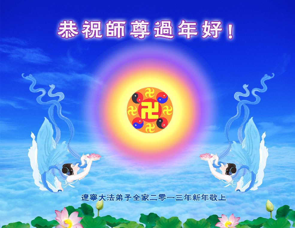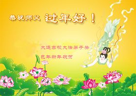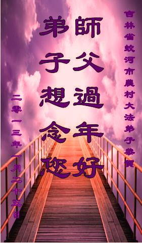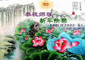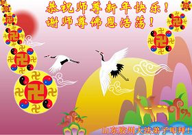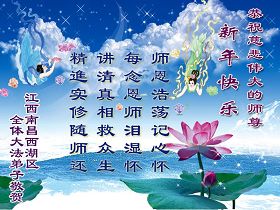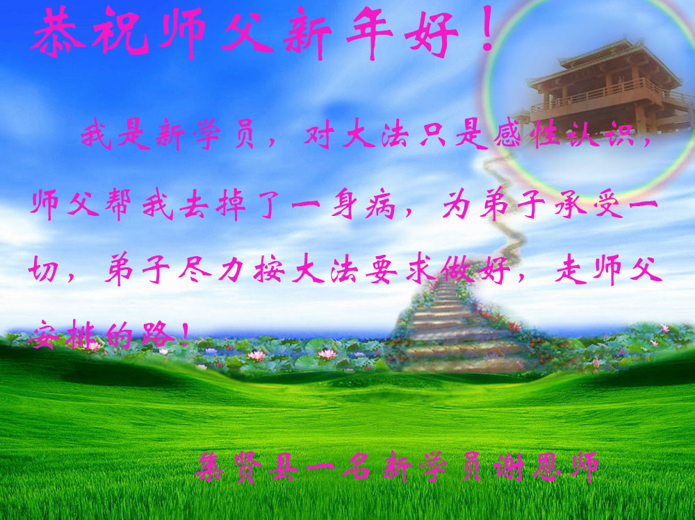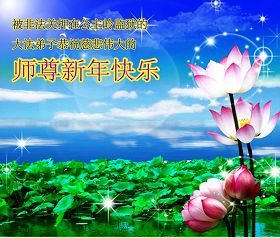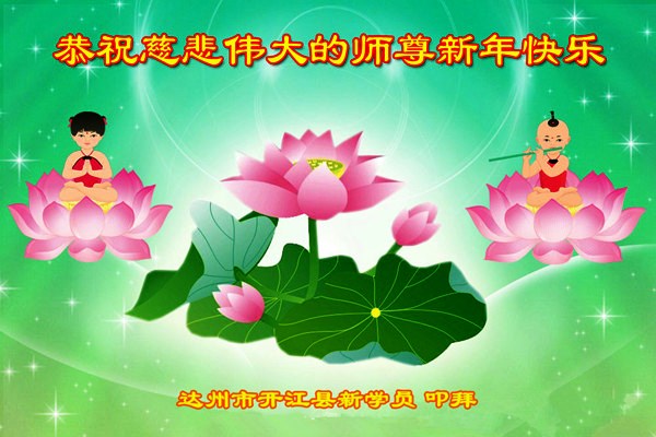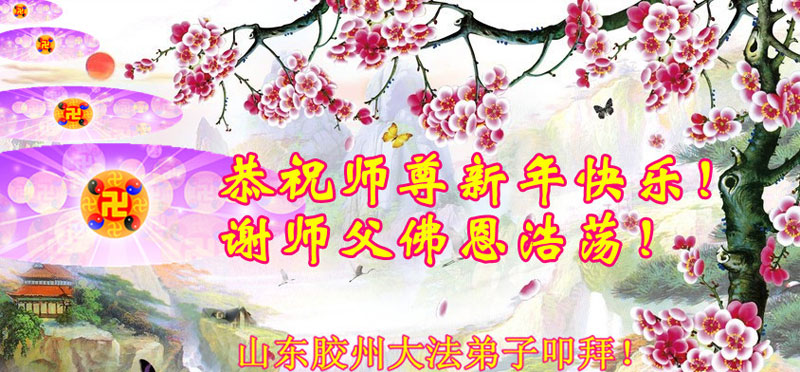 您为拯救众生、为您的弟子们修炼提高护航实在太辛苦了,您为人类带来了无限的光明和希望。看到您的弟子在中共高压迫害的14年里,他们一如既往,年复一年日复一日的做着讲清真相救人的大事,而且不求回报,无私付出,只有您这高德师父才会教出如此善良无私的徒弟。为表敬意,借新年佳节之际发个贺卡,祝您新年愉快,合家欢乐。