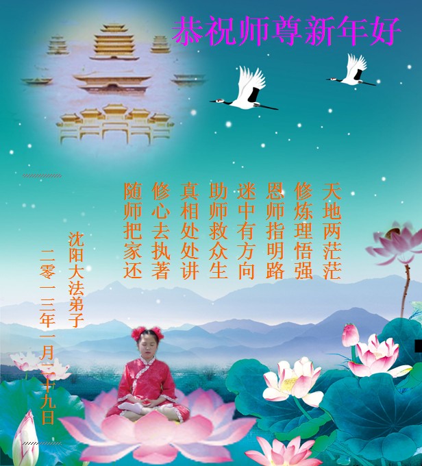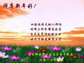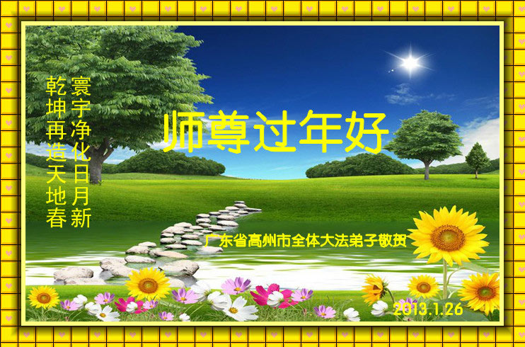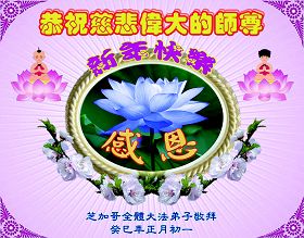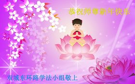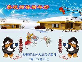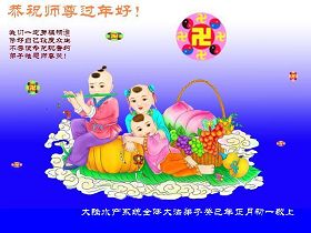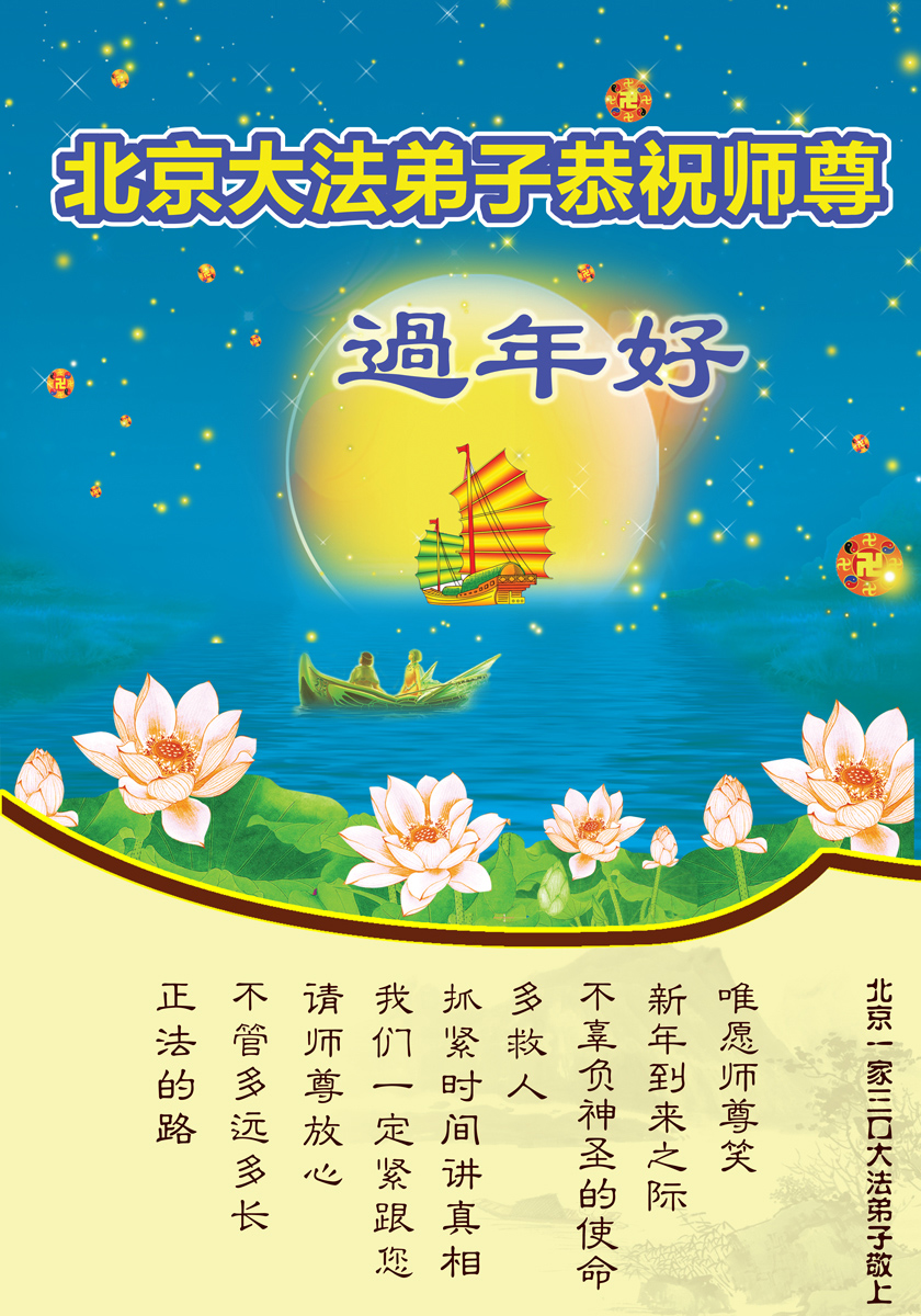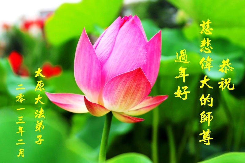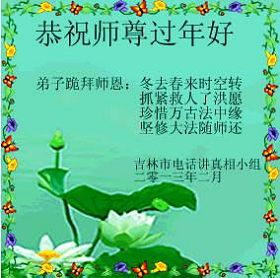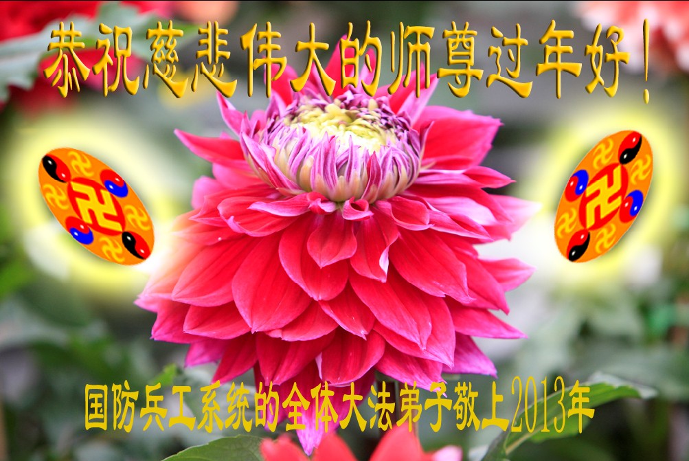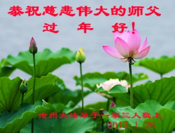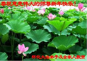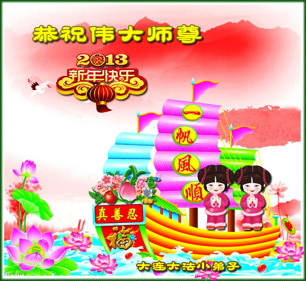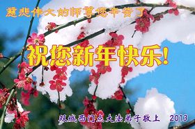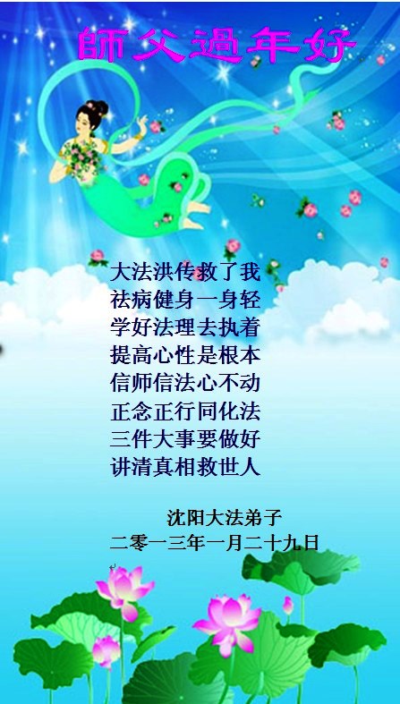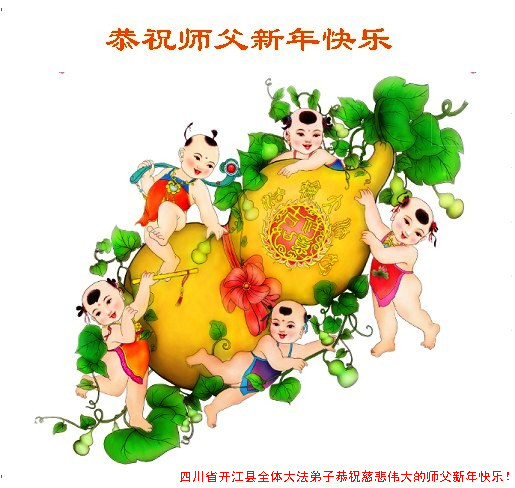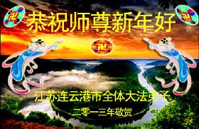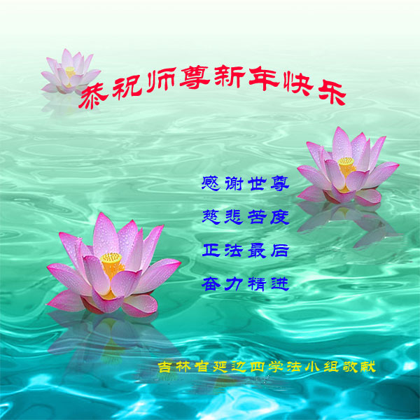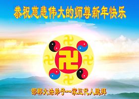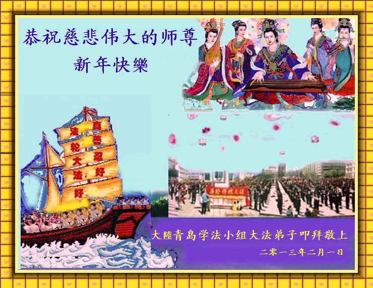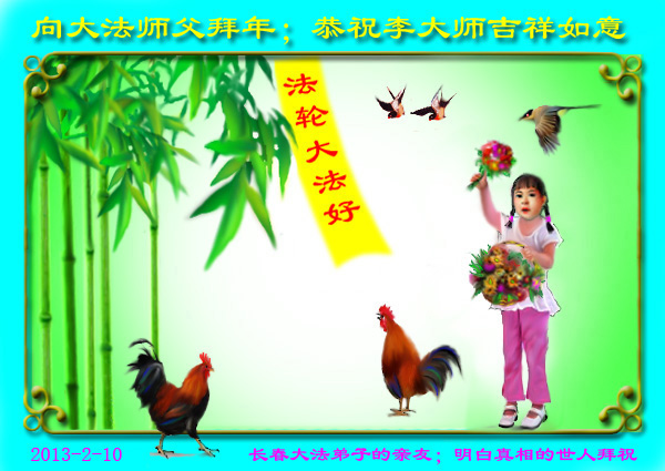 您为拯救众生、为您的弟子们修炼提高护航实在太辛苦了,您为人类带来了无限的光明和希望。看到您的弟子在中共高压迫害的14年里,他们一如既往,年复一年日复一日的做着讲清真相救人的大事,而且不求回报,无私付出,只有您这高德师父才会教出如此善良无私的徒弟。为表敬意,借新年佳节之际发个贺卡,祝您新年愉快,合家欢乐。