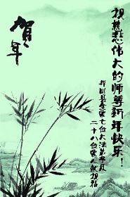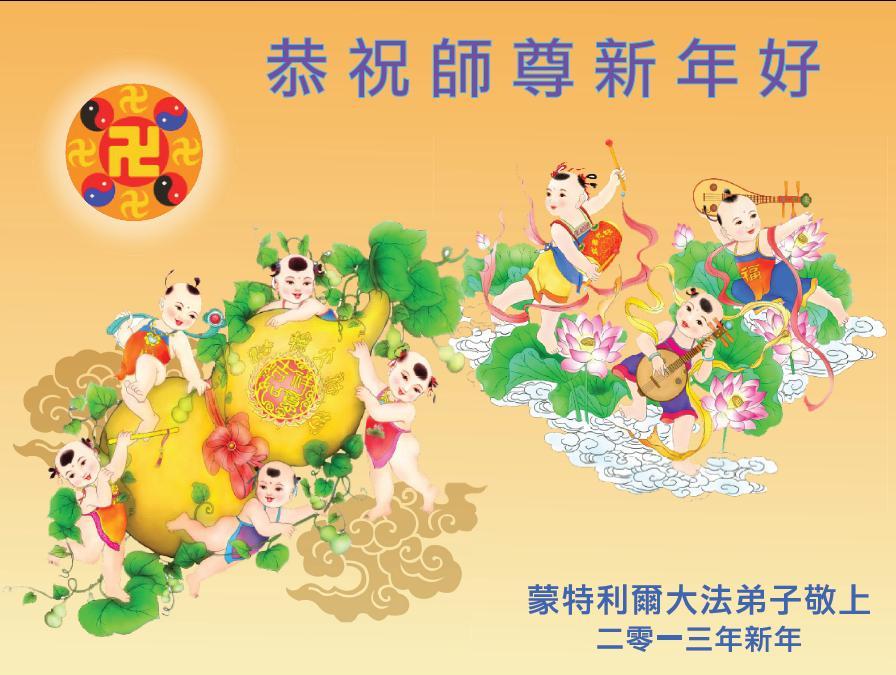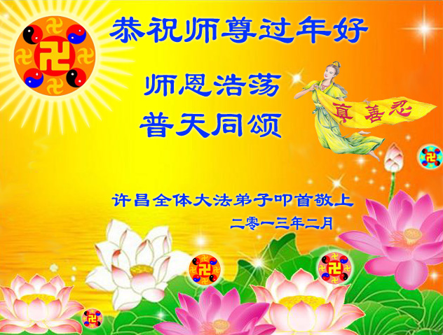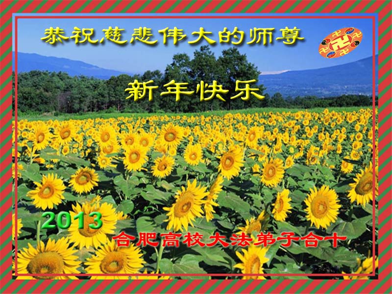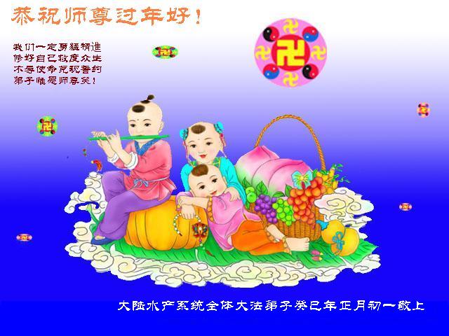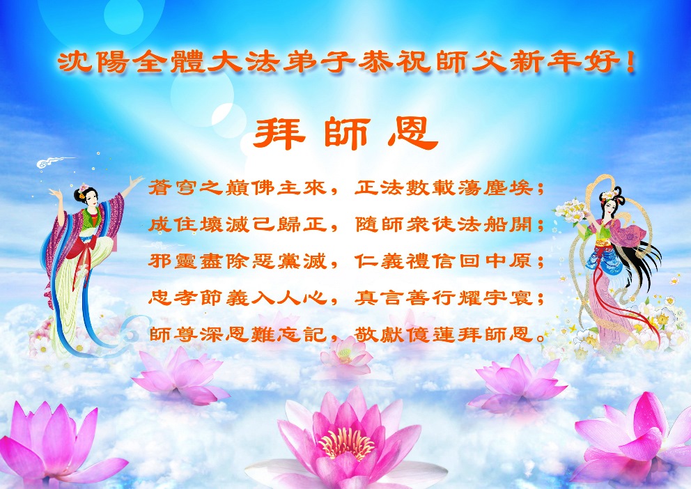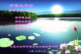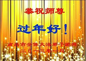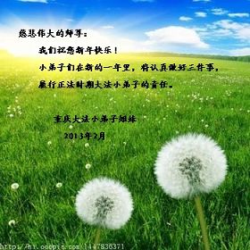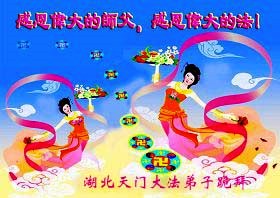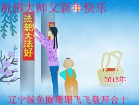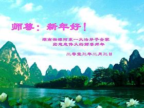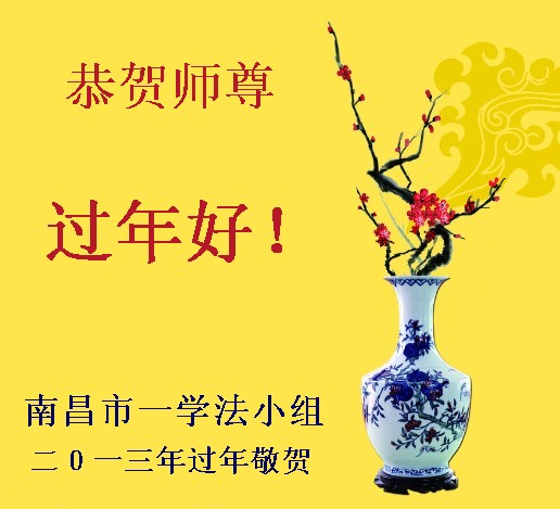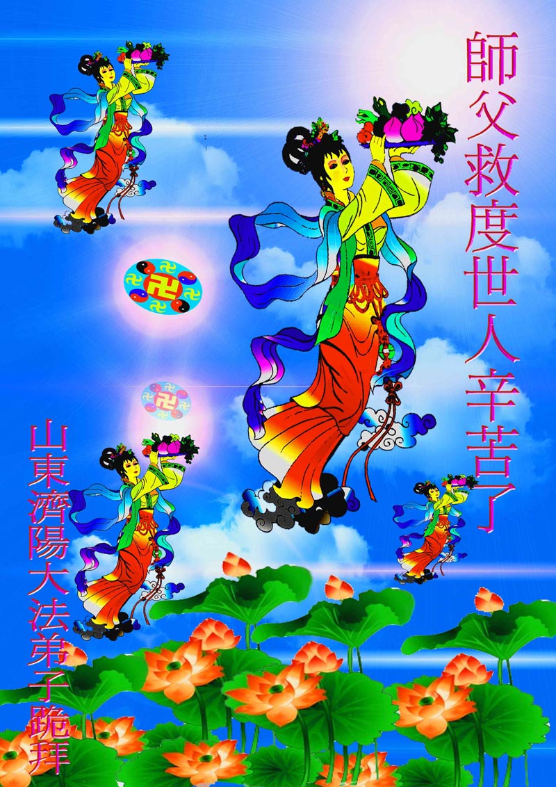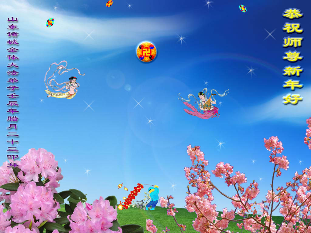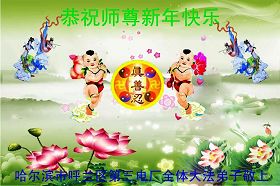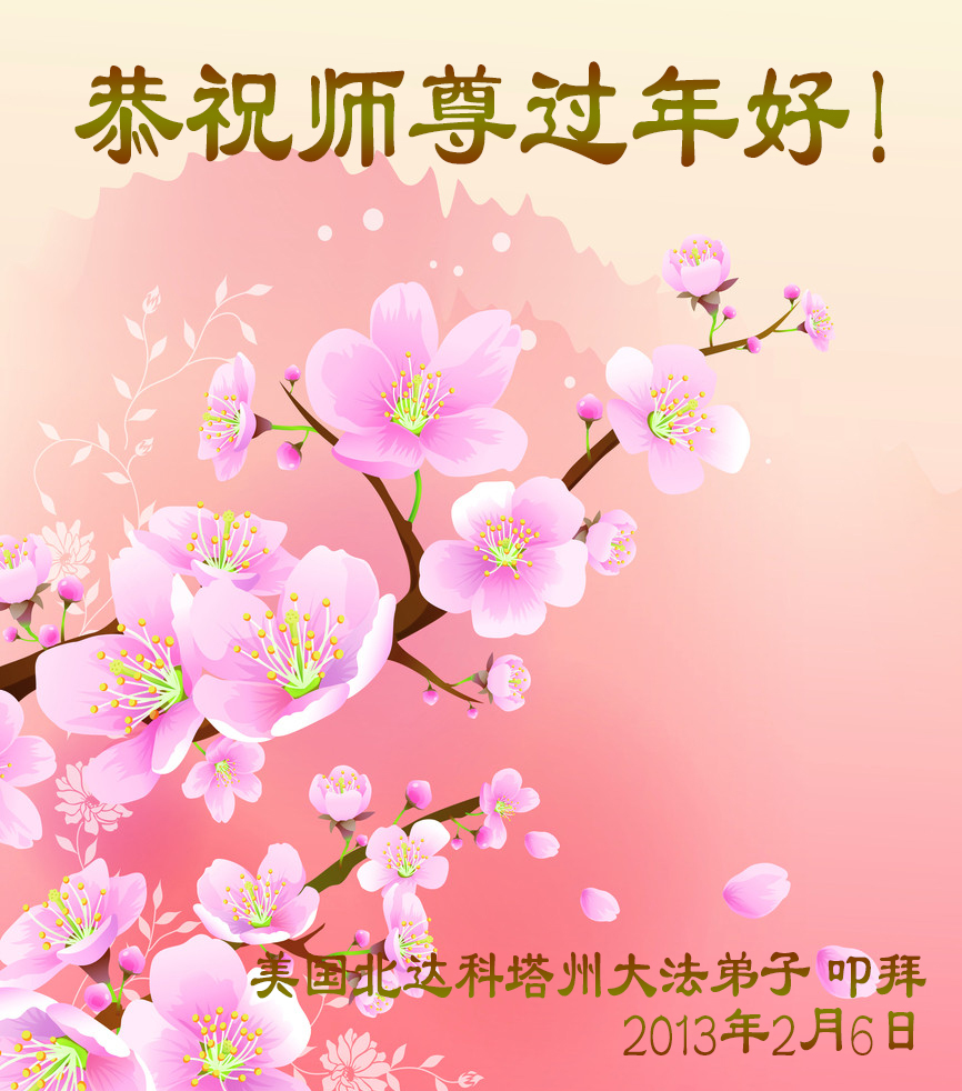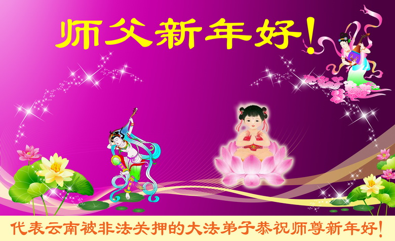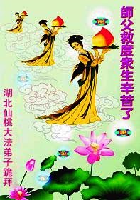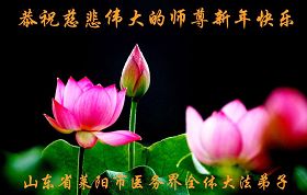 您为拯救众生、为您的弟子们修炼提高护航实在太辛苦了,您为人类带来了无限的光明和希望。看到您的弟子在中共高压迫害的14年里,他们一如既往,年复一年日复一日的做着讲清真相救人的大事,而且不求回报,无私付出,只有您这高德师父才会教出如此善良无私的徒弟。为表敬意,借新年佳节之际发个贺卡,祝您新年愉快,合家欢乐。