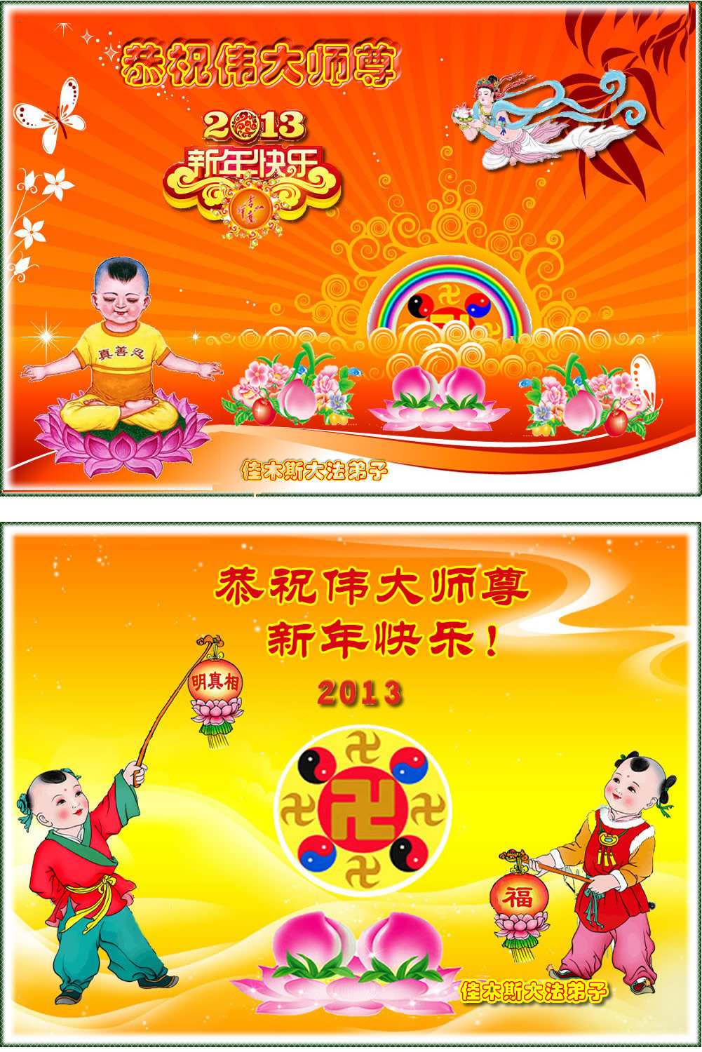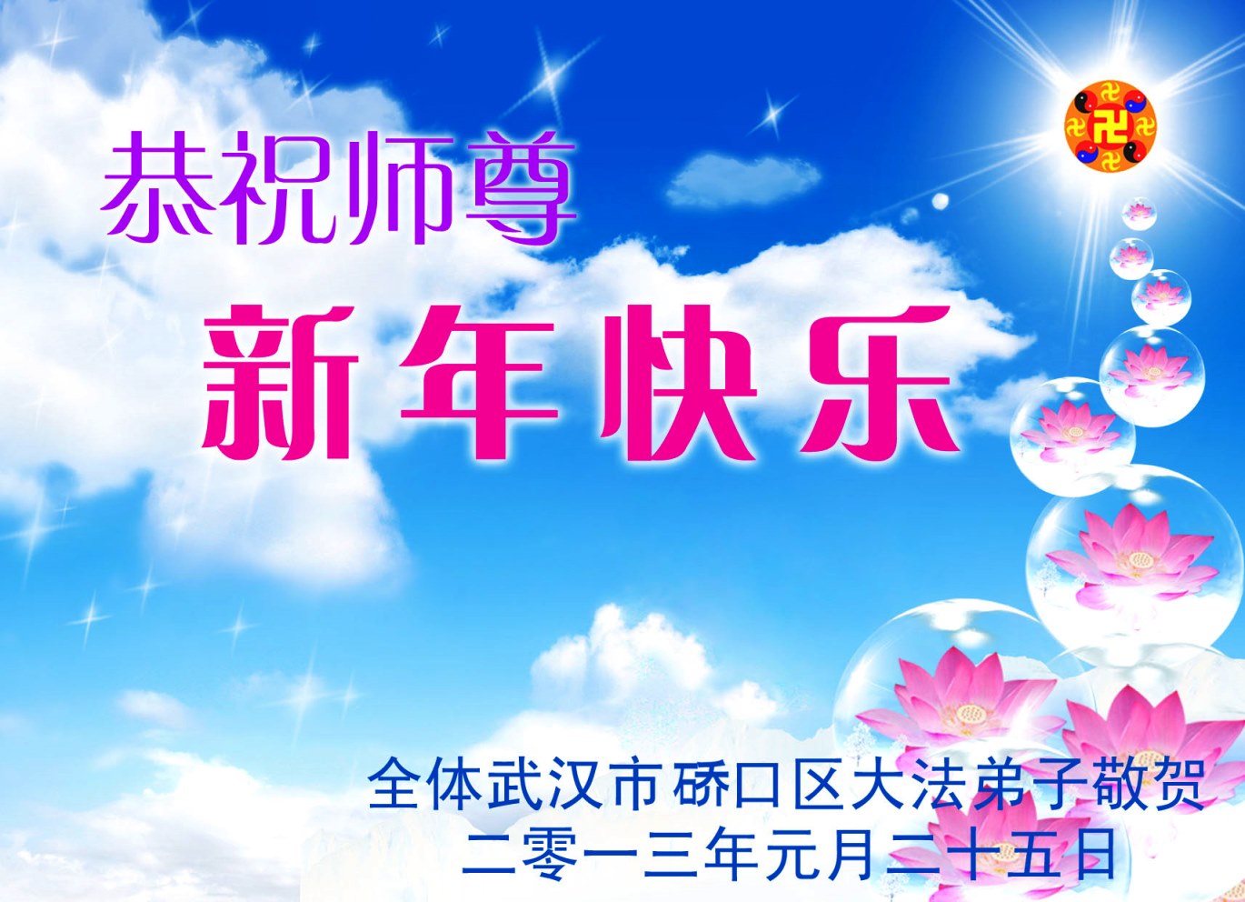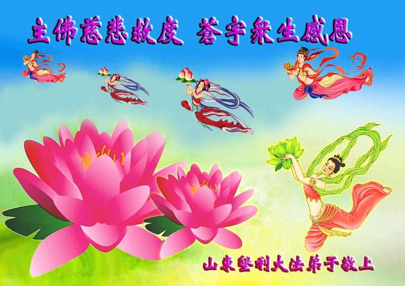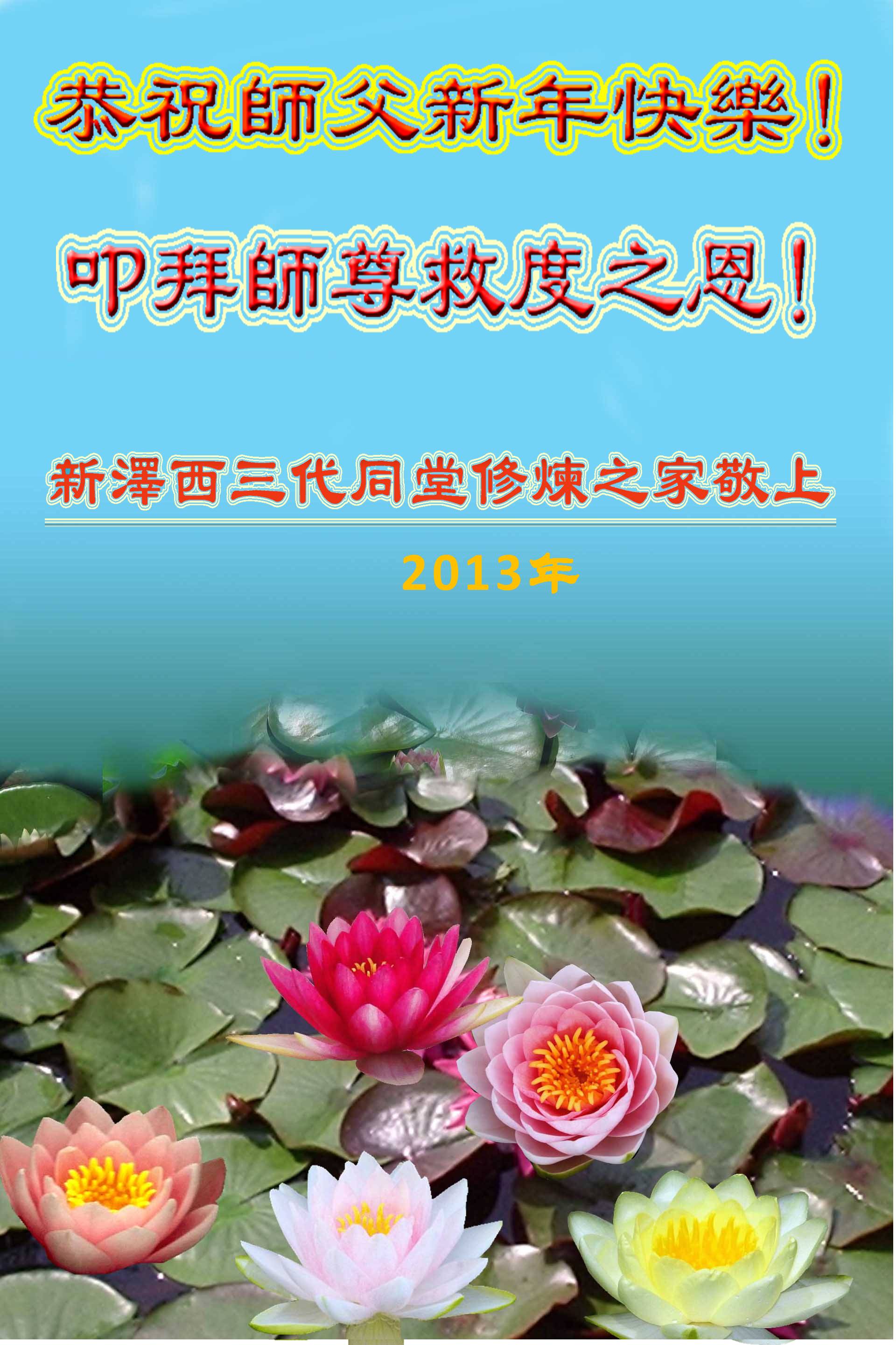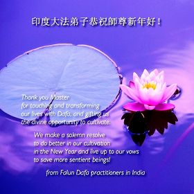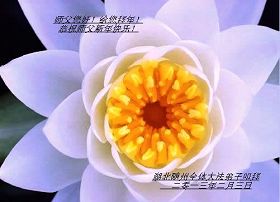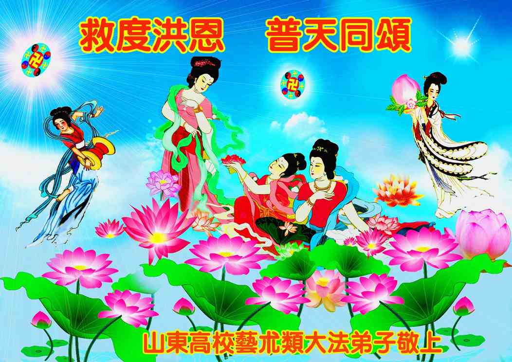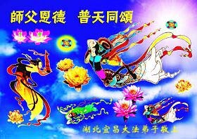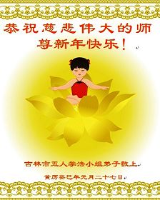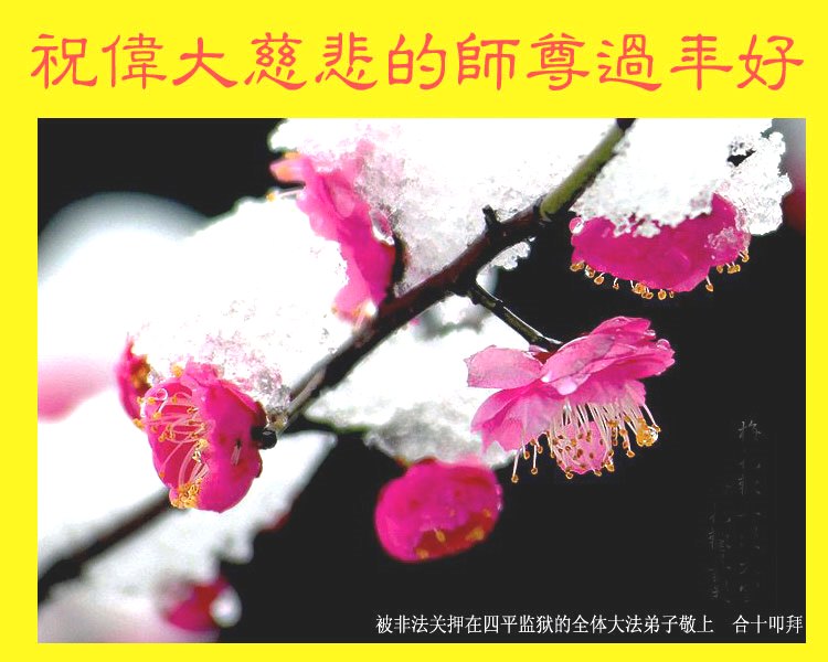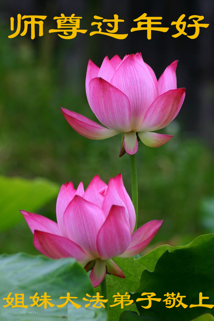 您为拯救众生、为您的弟子们修炼提高护航实在太辛苦了,您为人类带来了无限的光明和希望。看到您的弟子在中共高压迫害的14年里,他们一如既往,年复一年日复一日的做着讲清真相救人的大事,而且不求回报,无私付出,只有您这高德师父才会教出如此善良无私的徒弟。为表敬意,借新年佳节之际发个贺卡,祝您新年愉快,合家欢乐。