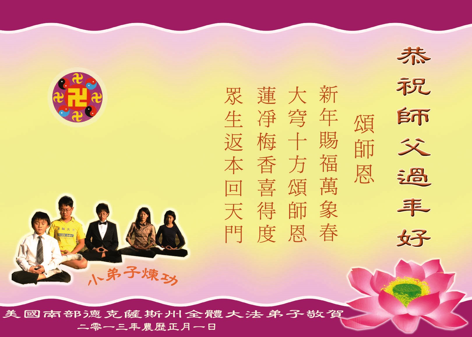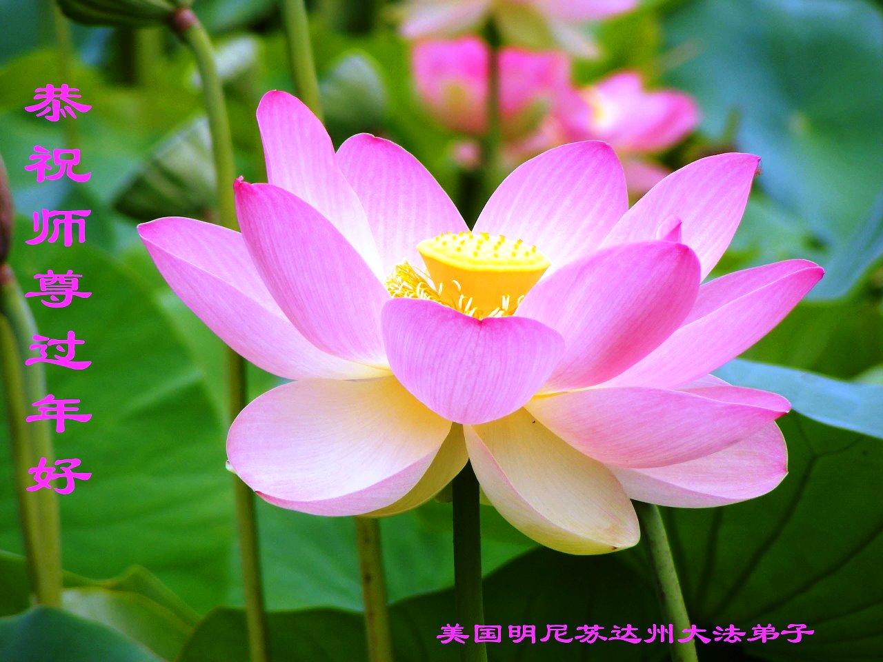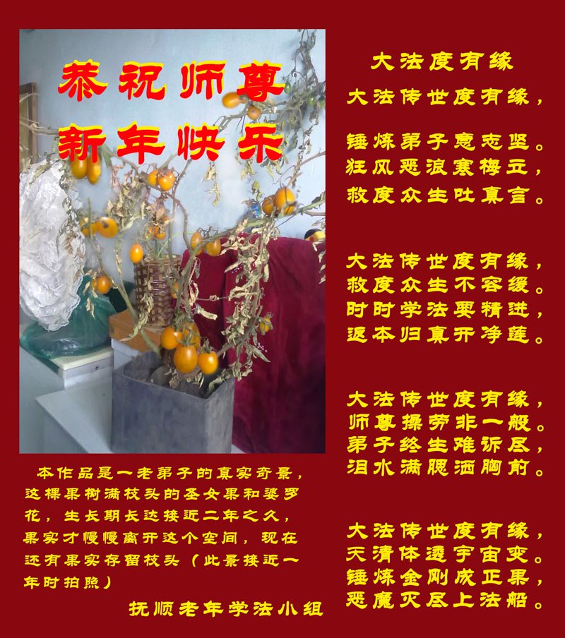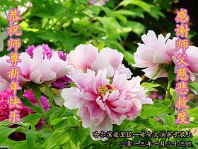 我们向师父献上一份节日的问候。在新的一年里,我们一定要按照师父的要求,把三件事做得更好,不辱使命,救度众生,圆满随师返。