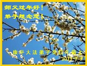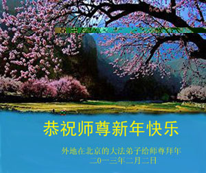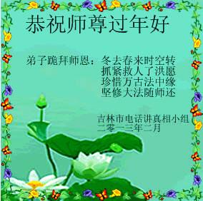 新春佳节,弟子想念师父,跪拜师父!我们知道师父的心愿是要把我们度成,要让更多的众生得救,师父的一切都是为了我们!为了众生!师父为我们弟子和众生承受的太多太多了。我们就只有修好自己,多救人,才能让师父高兴。新的春天开始了,我们一定要做好师父要我们做的一切,珍惜师父留给我们的每一天,整体配合好,让更多的人来看神韵,让更多的人明白真相得救!