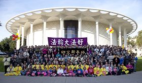 2013年中国新年前夕,洛杉矶法轮功学员聚集在加州理工学院大礼堂前,集体向伟大慈悲的师父拜年。