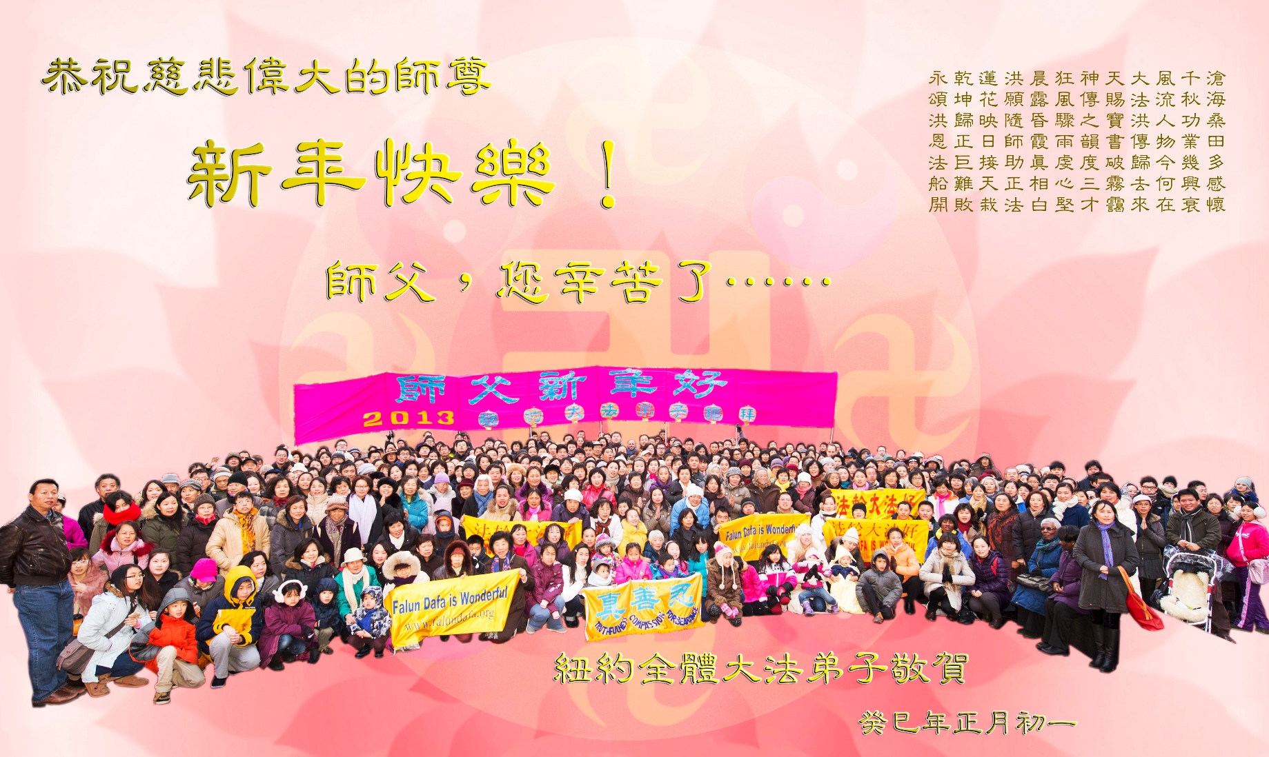 <英文版: http://en.d2s3ombhnov3zf.cloudfront.net/html/articles/2013/2/10/137555.html>美国纽约华府费城等地大法弟子给师父拜年(12条)