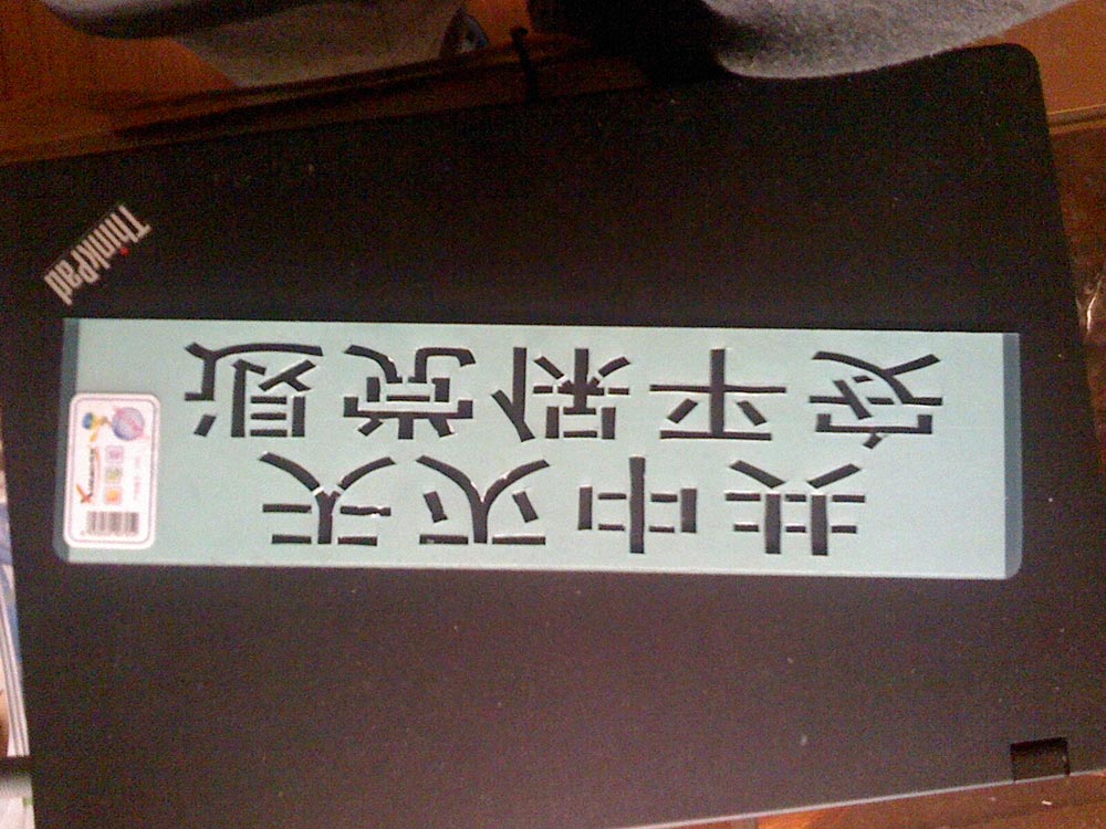 一、 在word里‘页面布局’栏,页面方向选‘横向’(打横字时),页边距选‘适中’,纸张选A4,然后选‘插入’,选‘艺术字’,选‘空心字’,打上要刻的字,选择粗(B)、正体(I)、字体选‘黑体或宋体’,然后在word里用鼠标点中周边出现八个小圆圈,把鼠标放在右下角斜着拉动鼠标就可放大图片到合适大小。裁下贴在塑料模板上,用刻刀把字刻下来,注意字中空的地方不要刻,如中字那两个口请看图。