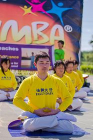 约上午十一时,在司仪给大家介绍法轮功后,十多名法轮功学员在活动主台开始为大家示范法轮功五套功法,祥和的功法给与会者留下了深刻的印象。