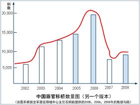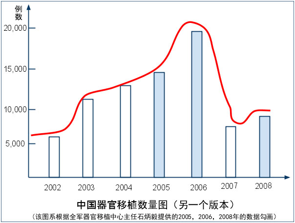 我们可以这么说,目前每年一万例也可能是中共故意往高说的,因为如果说成了跟2002年一样的五、六千水平,那么,2003-2006年突然高高崛起的一万五到两万例,又如何解释呢?“活摘”一曝光,就又回到了过去的水平,这不是明摆着不打自招吗?