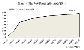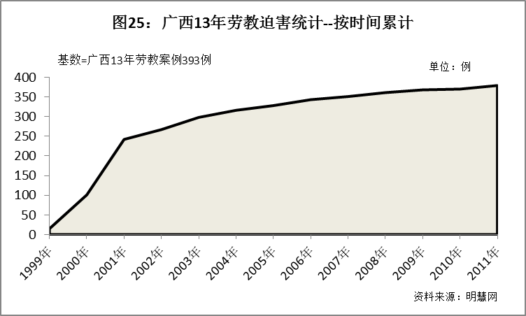 图25累积统计结果表明,从2000年开始,广西中共当局就把劳教作为迫害法轮功学员主要手段,然后随着2001年天安门自焚假案的发生,在该年度被劳教数量出现级数暴涨,一下子将劳教迫害推上一座高峰。几年来,有记录在案的广西法轮功学员被非法劳教案例为393例。