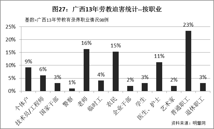 在393例劳教案例中,有98例有记录到受害者职业情况。图27统计结果表明,在这些被劳教的法轮功学员中,普通职工占比最高,为23%,其次老师16%,农民15%,医生护士11%。