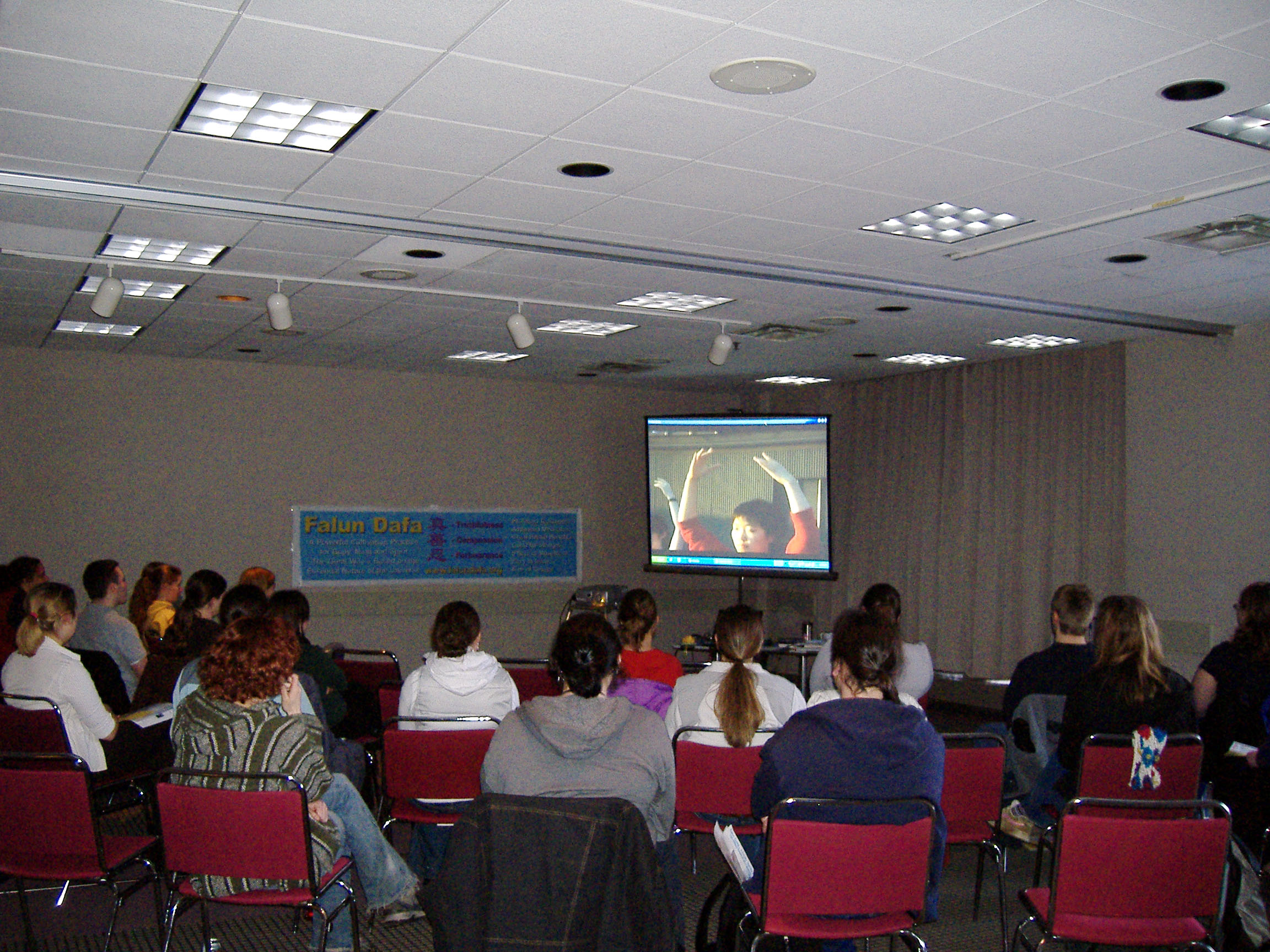讲座开始时先向师生们介绍什么是法轮功,以及法轮功的弘传情况;然后,开始学炼五套功法,祥和而舒缓的动作,加上炼功音乐,都会让师生们非常感兴趣;在对法轮功有了基本了解后,学员为大家讲解迫害法轮功的真相,并播放真相纪录片,特别是中共活摘法轮功学员器官的血腥罪恶,短短的几个小时之内,善与恶的强烈对比,给这里的师生们留下了深刻的印象,他们都表示会到白宫网站请愿书上签名,要求美国政府关注中共活摘法轮功学员器官的暴行;或表示通过自己的网络社交网,把真相再传播广一些;有些观众表示自己曾经在华盛顿DC等大城市看到过大法的活动,能在这里再次看到如此详尽的真相,很难得,对于法轮功学员遭受的非法迫害,心里非常难受;有些观众表示要和自己认识的组织或地方政府联系,请法轮功学员到更多的地方举办讲座,传播真相。有的观众表示看到过校园里征签的海报,已经到白宫网站上签名了。