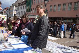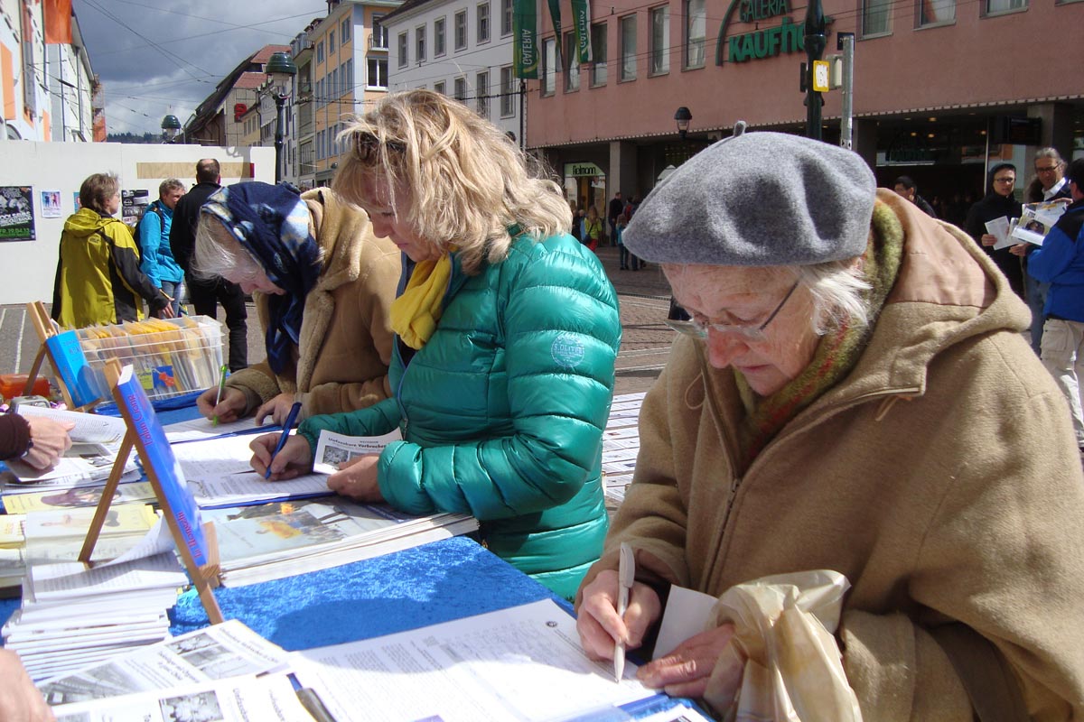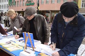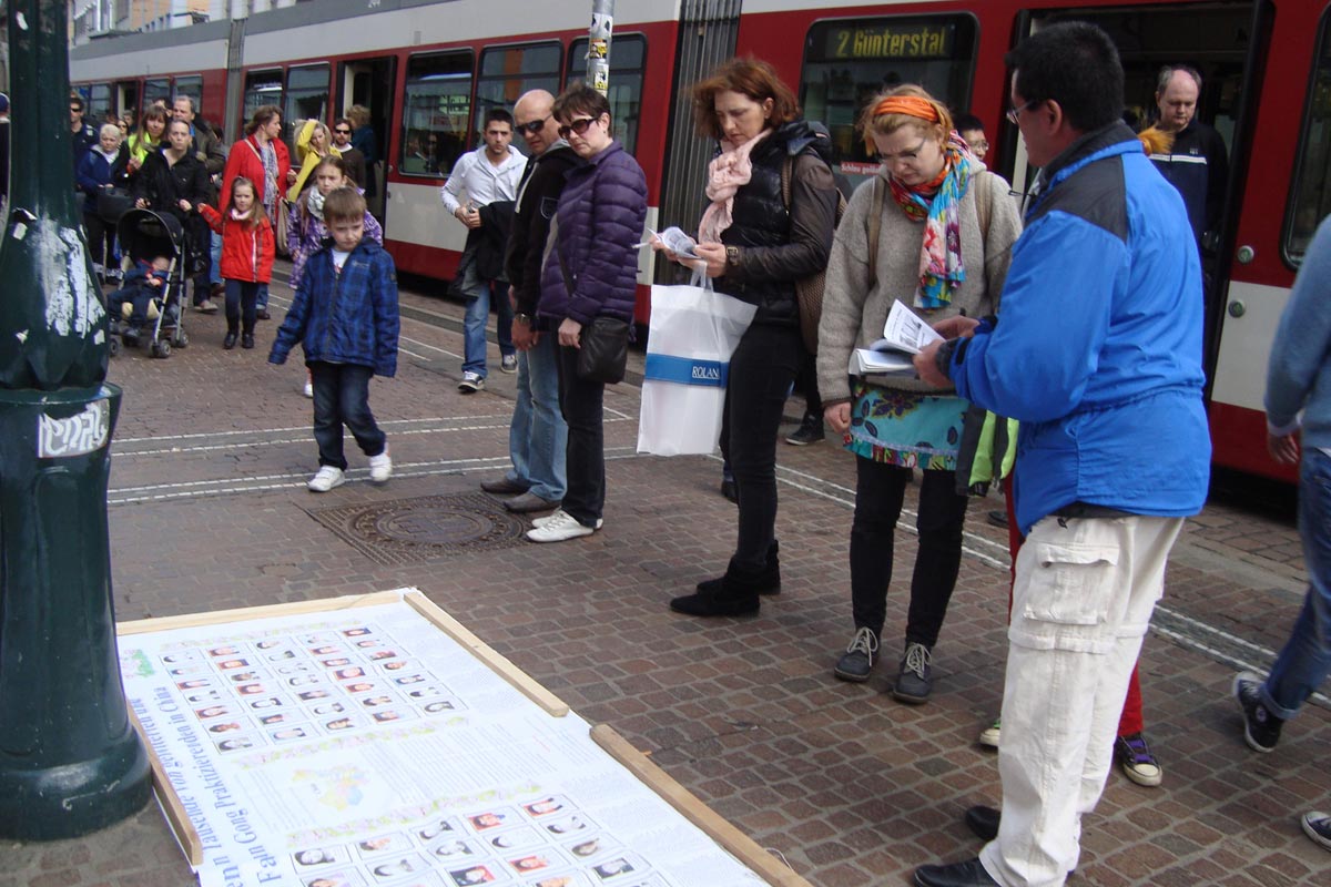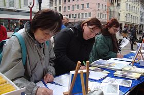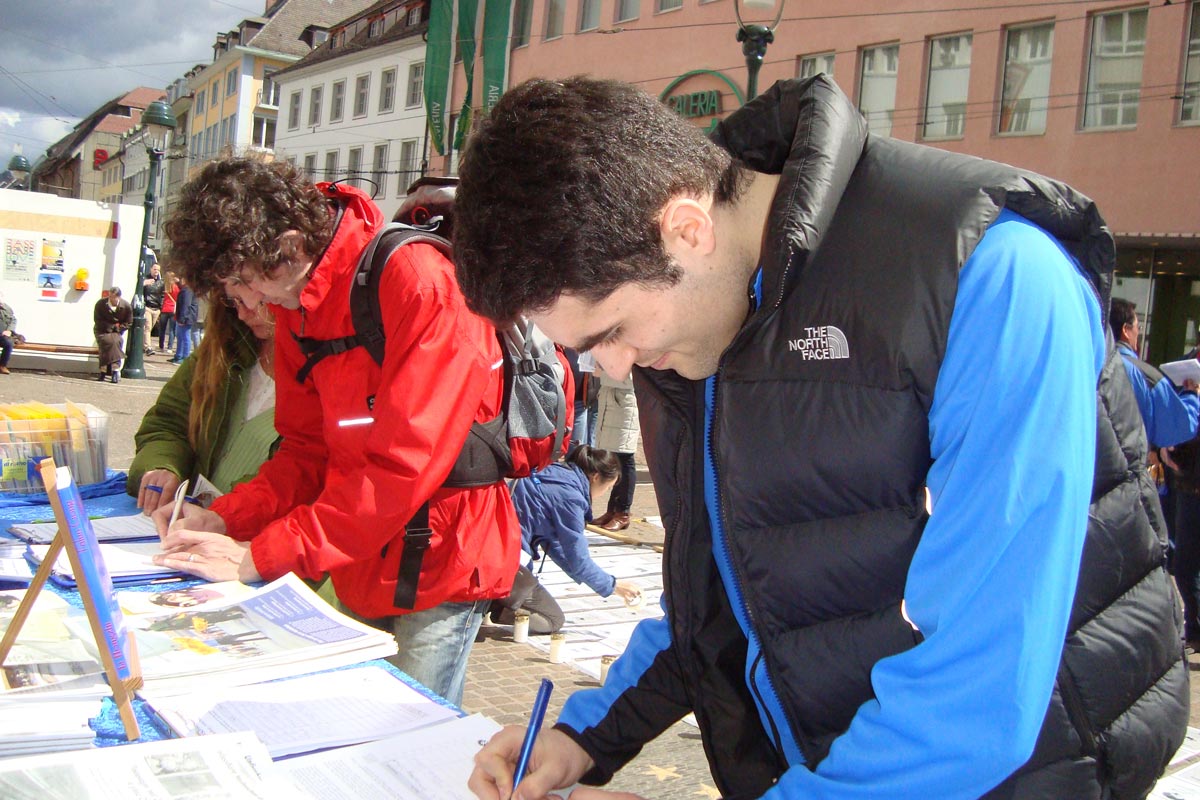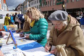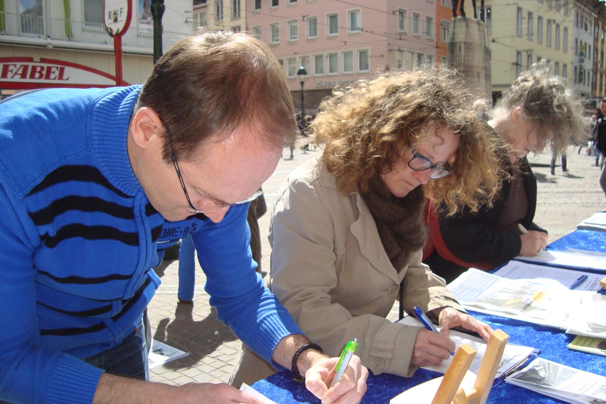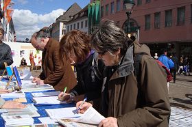 一位五十岁左右的男子看着手里关于“活摘“的资料,边看边说:“这太恐怖了!但是我们能做什么呢?”学员回答:“您可以在征签簿上签名,表示您支持反迫害。”他说:“我毕竟在德国,而那不过是一张纸,能起什么作用?”学员说:“如果有更多的像您一样有正义感的民众,在德国和更多的国家站出来声援反迫害,就会在全世界形成一股巨大的正义力量,中共在国际社会的巨大压力下,它必须要改变!您说不是吗?“这位德国先生点点头,向征签簿走去。