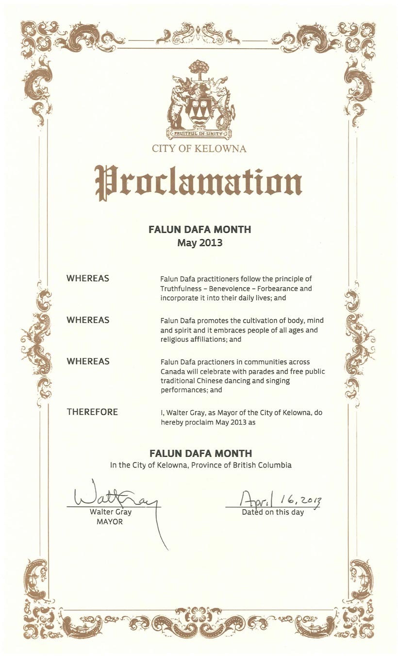 鉴此,我,基隆拿市长沃尔特﹒盖瑞(Walter Gray),特此褒奖二零一三年五月为基隆拿市“法轮大法月”。