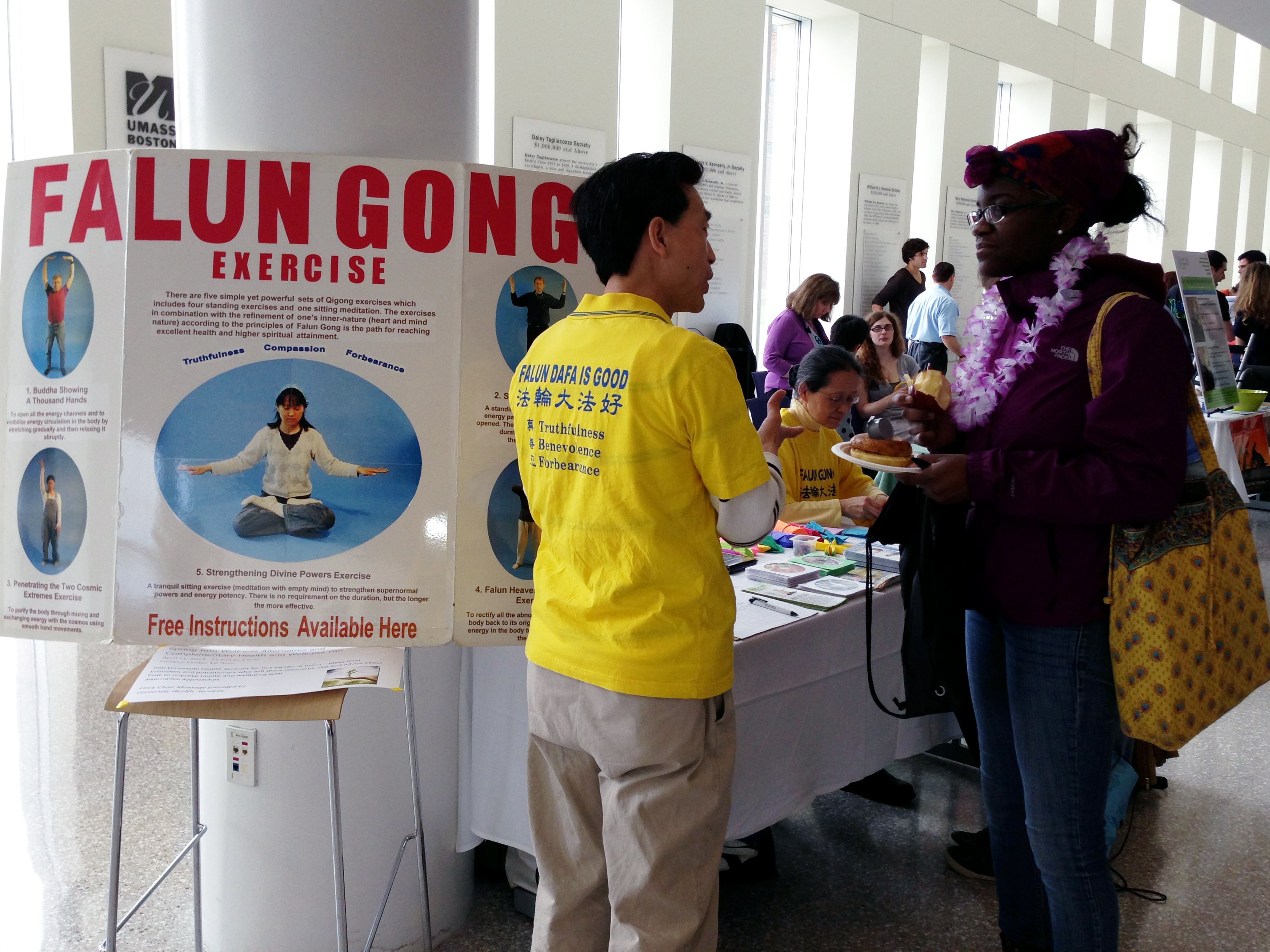 当天,法轮功展位是最受欢迎的摊位之一,很多学生驻足观看法轮功功法演示后就开始学功、认识法轮功的美好及了解发生在中国的迫害事实。