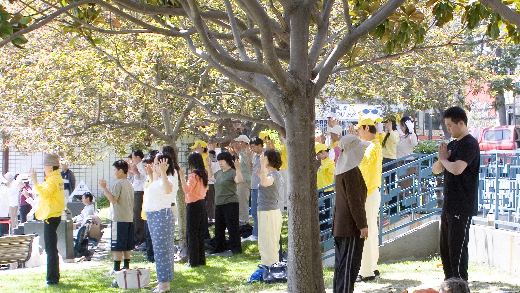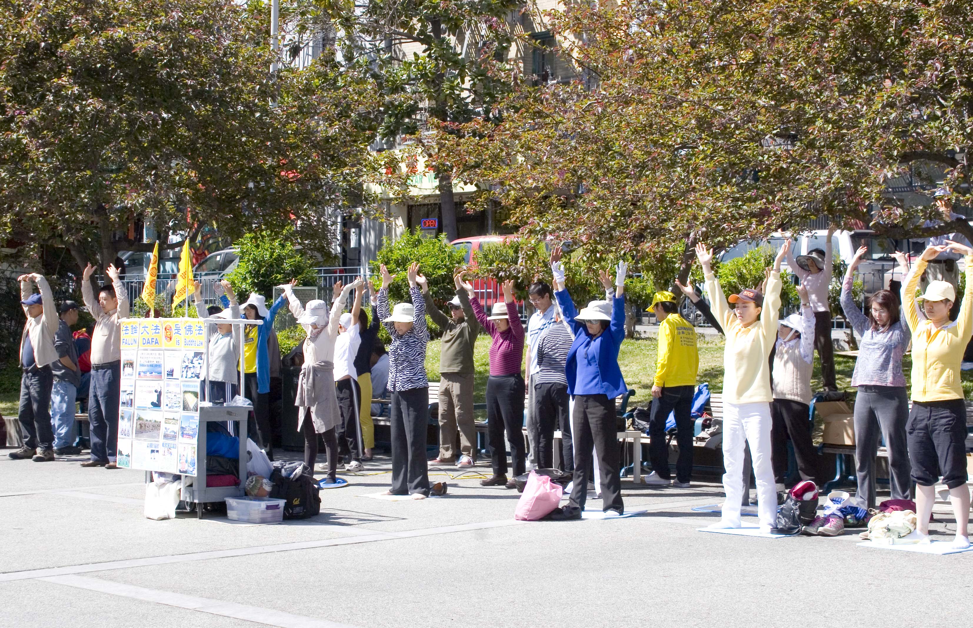 四月二十一日,旧金山阳光明媚、风和日丽,中国城的行人和游客不断,法轮功学员在花园角广场的炼功场面和图片展,吸引了很多过往的行人。不少人停留下来观看图片,并询问法轮功真相。还有的人当场开始学炼法轮功。