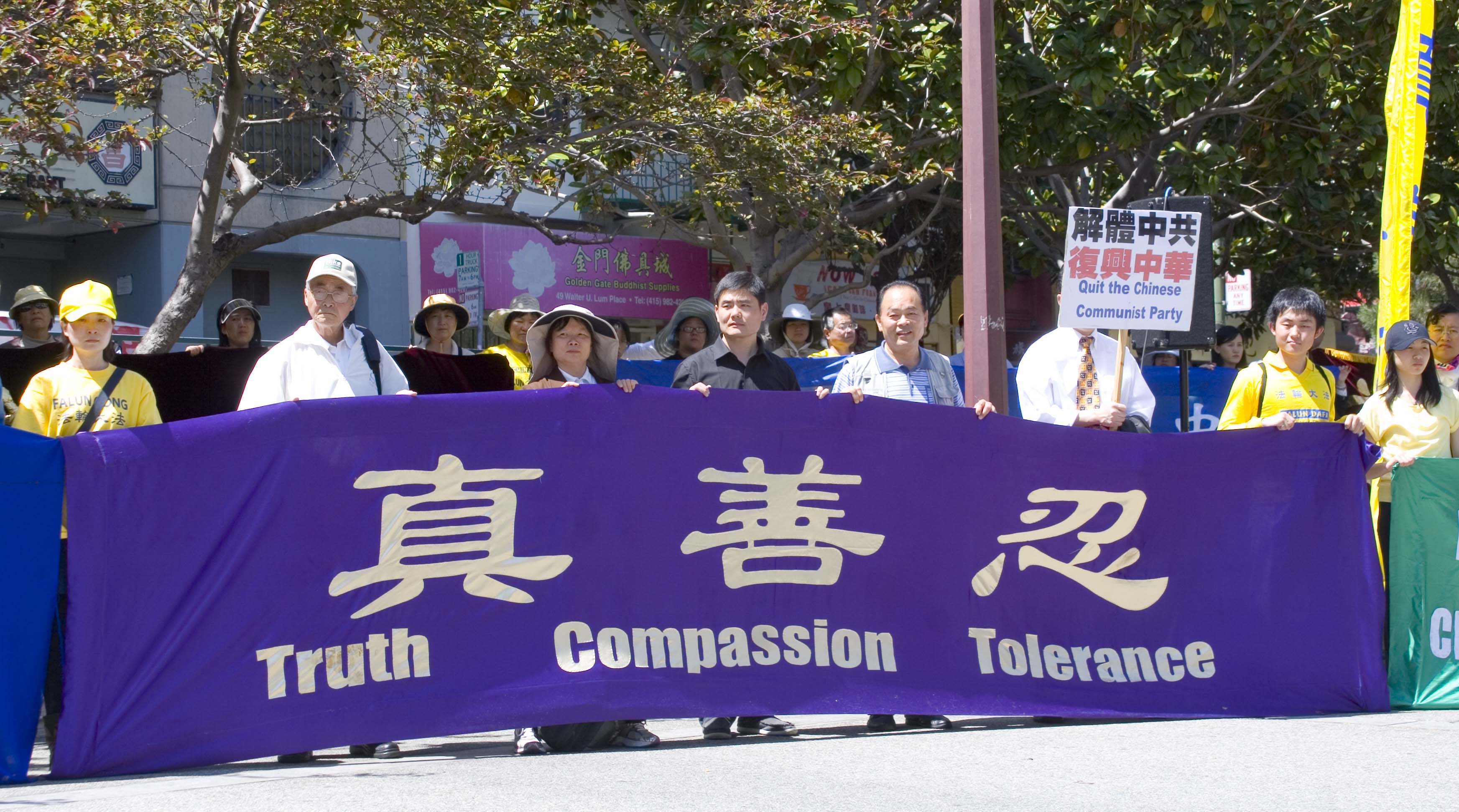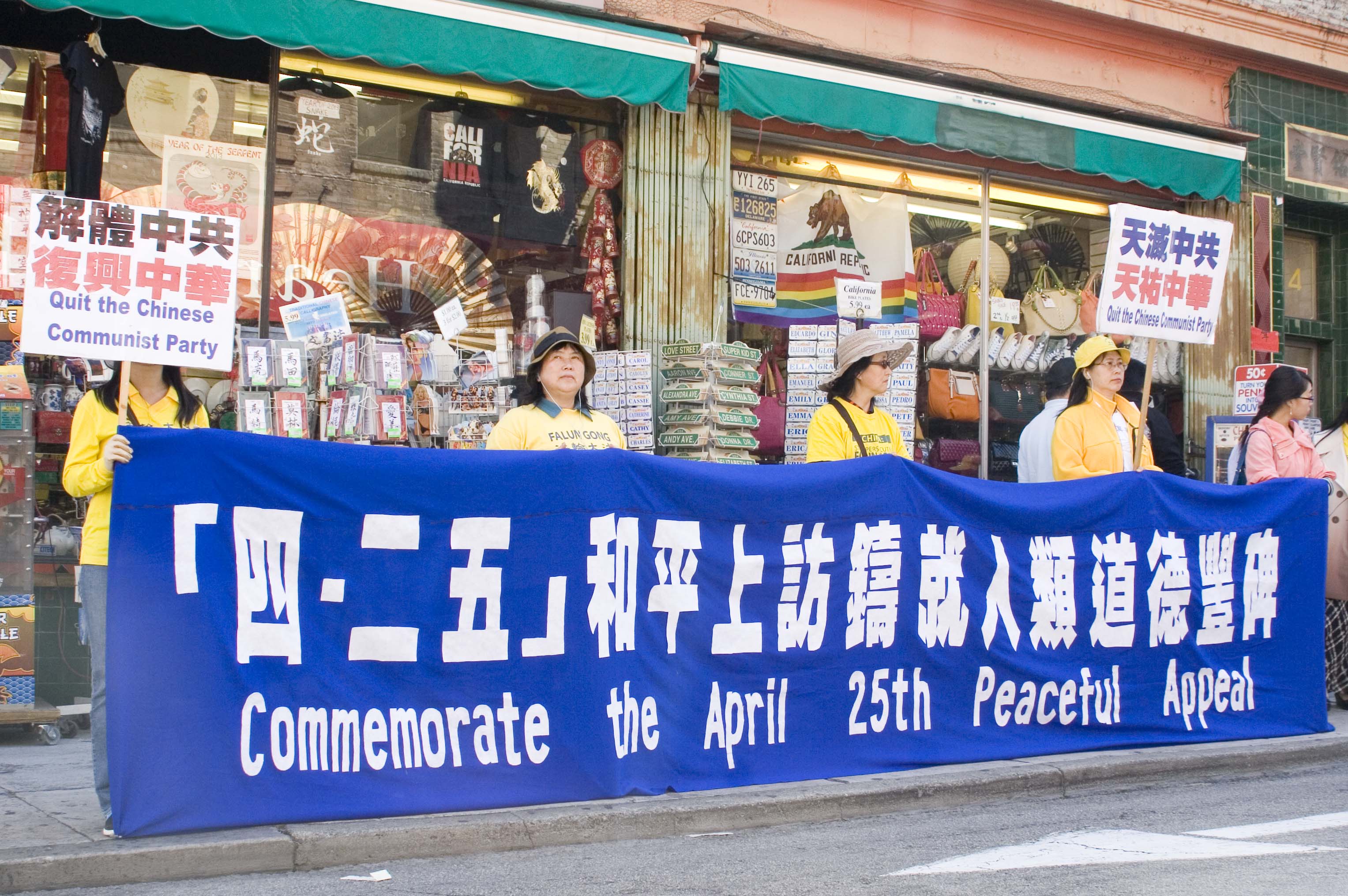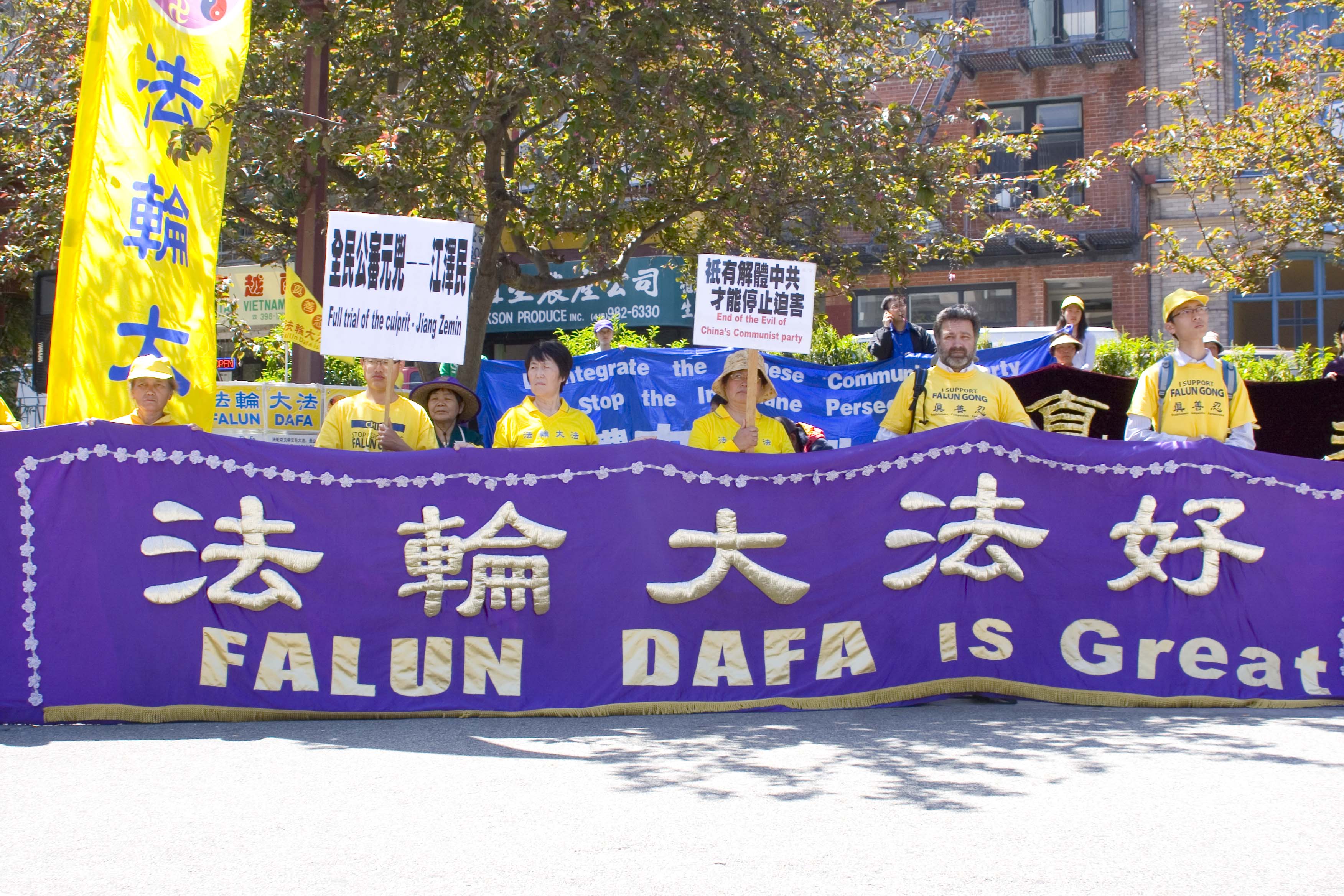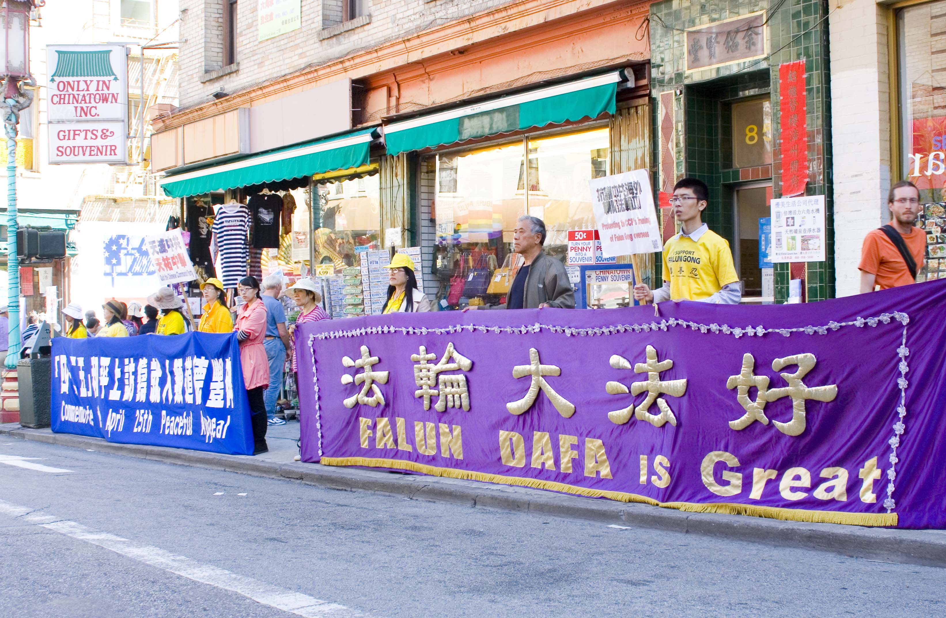 ![]() 法轮功学员在中国城街道拉起真相横幅 |