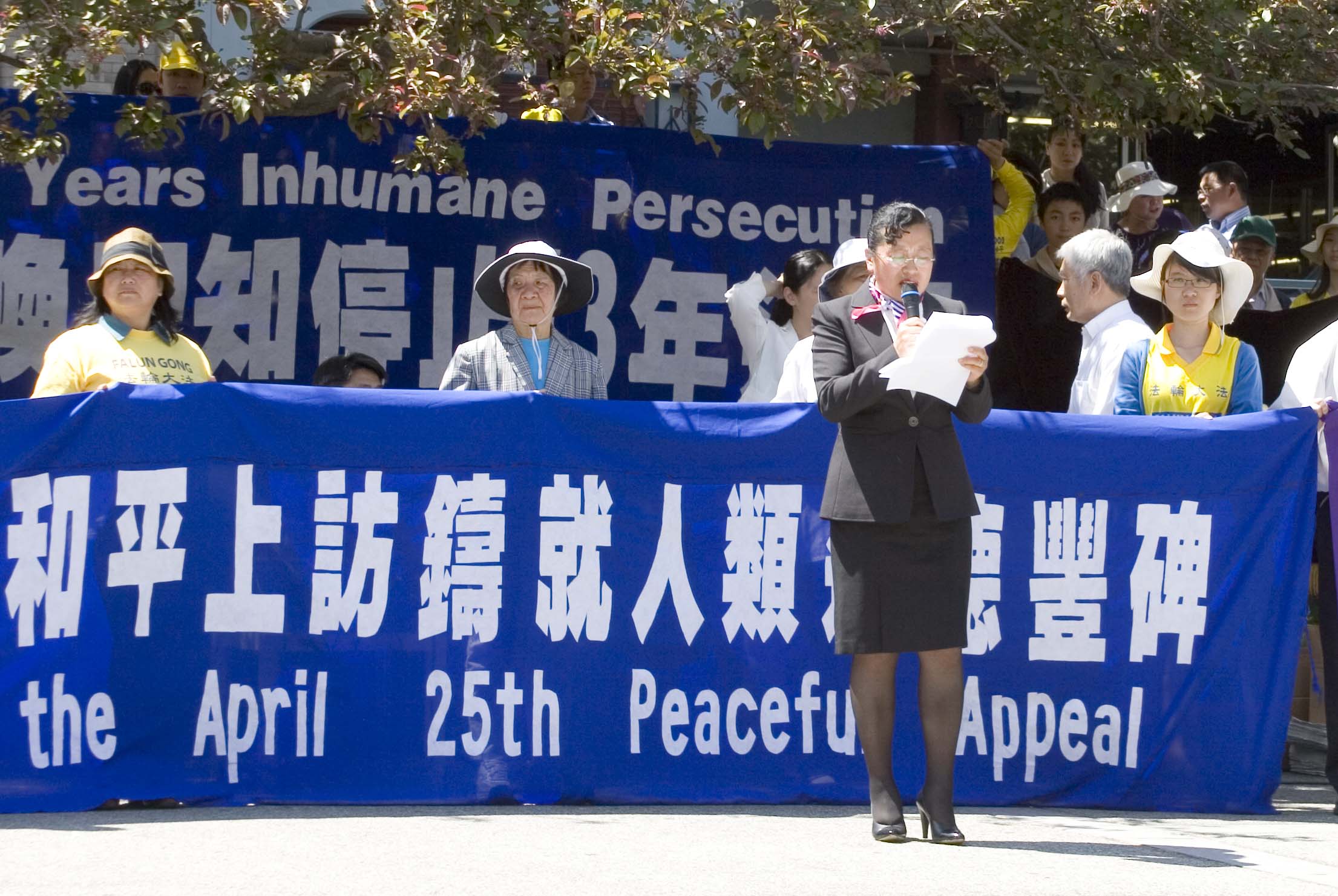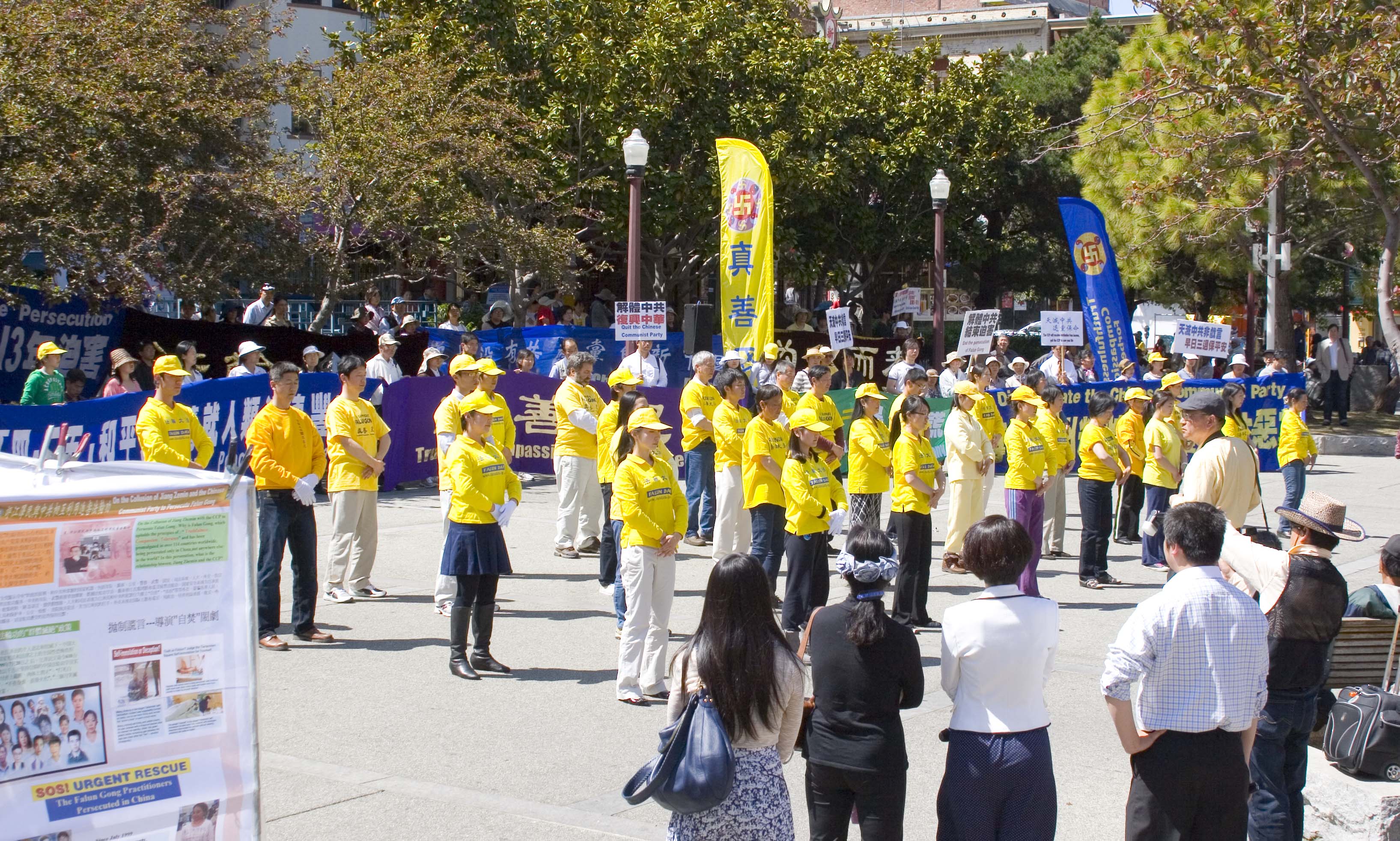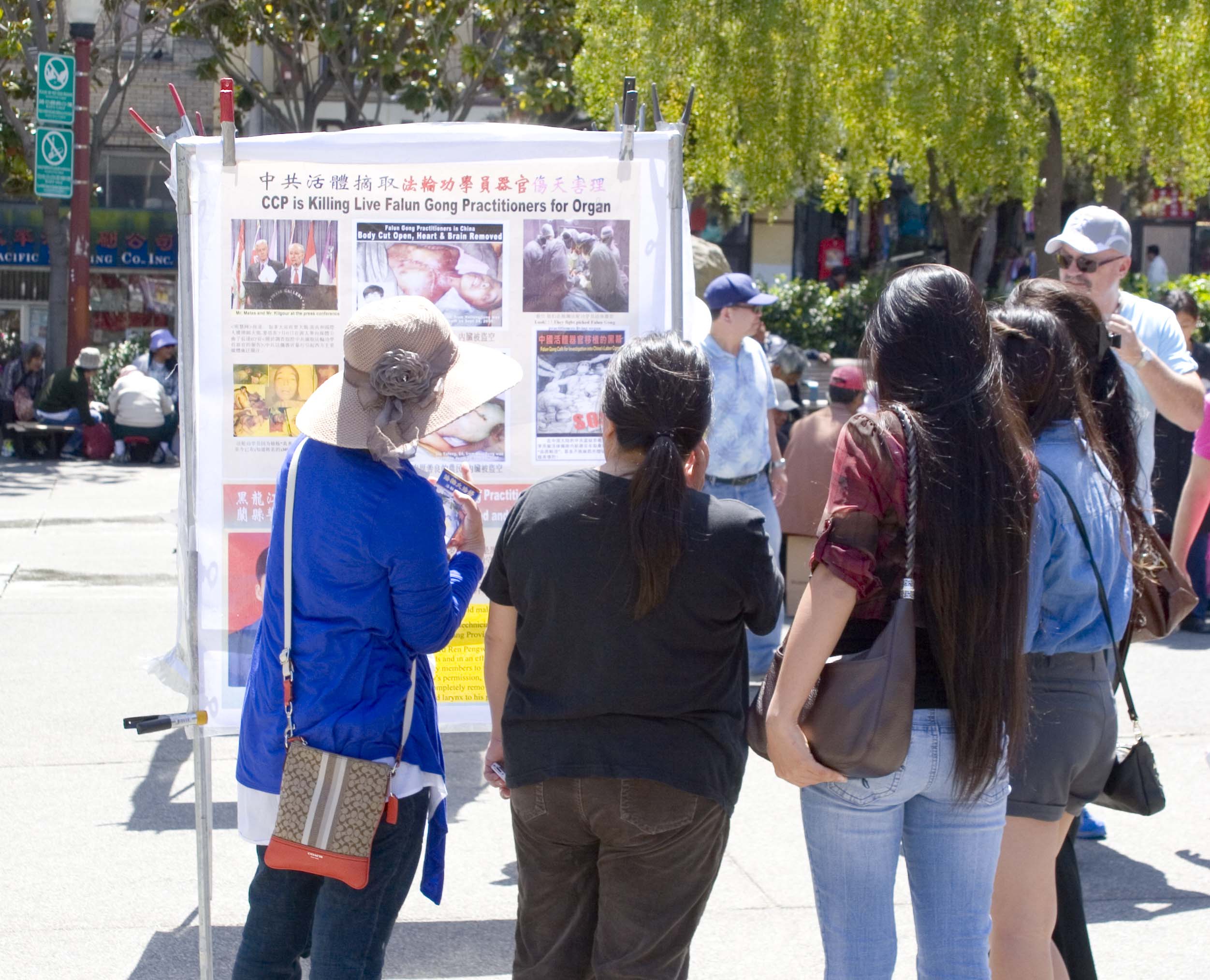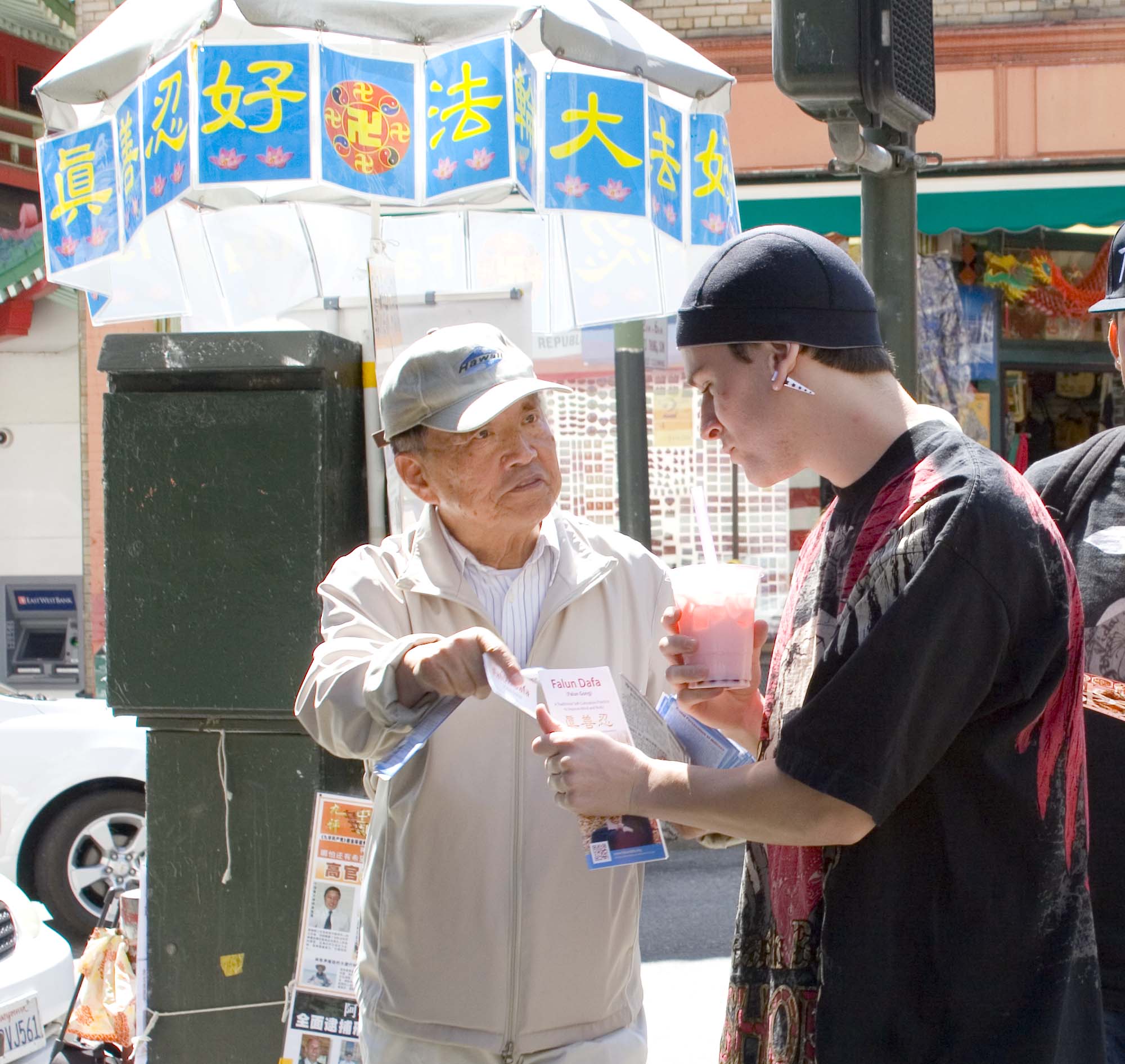 很多民众在现场了解法轮功功法和反迫害真相,还有人在听完学员介绍后,现场就开始学炼动功。从纽约来旧金山旅游的Tammy看到街道两旁手持横幅的法轮功学员,走上前去询问。