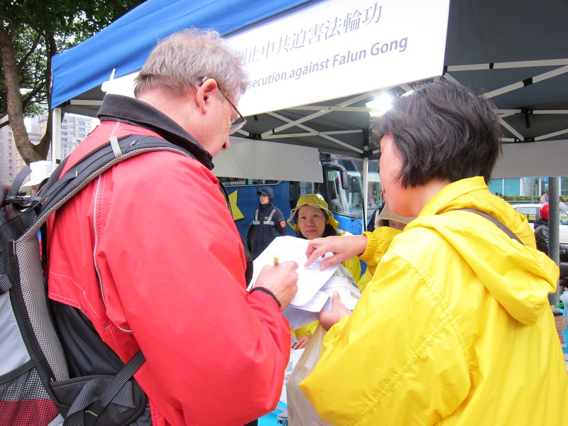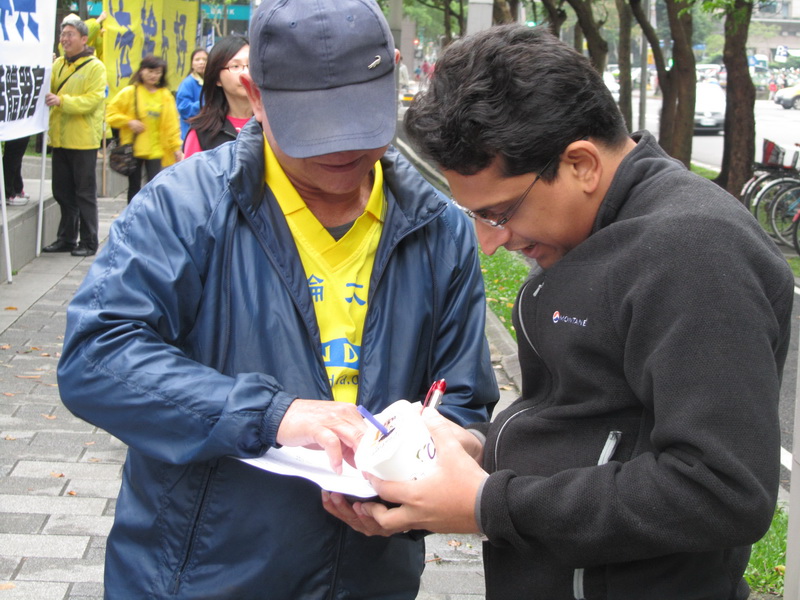 一位自印度来台办理业务的先生,驻足观看学员集体炼功觉的非常祥和,看到右侧“老虎凳”、“吊刑”的中共酷刑迫害模拟展示,和左侧的“活摘器官”模拟展示,感到疑惑不解,听了学员讲的真相并且细看征签内容后,立即在声明书上签名,并且表示必须要支持制止迫害。