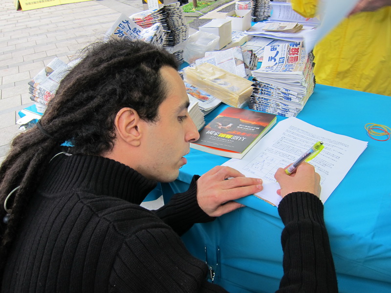 一位法国男士签名后,学员问他知不知道中国大陆发生(迫害法轮功的)这些事情,这位法国男士说他都知道。