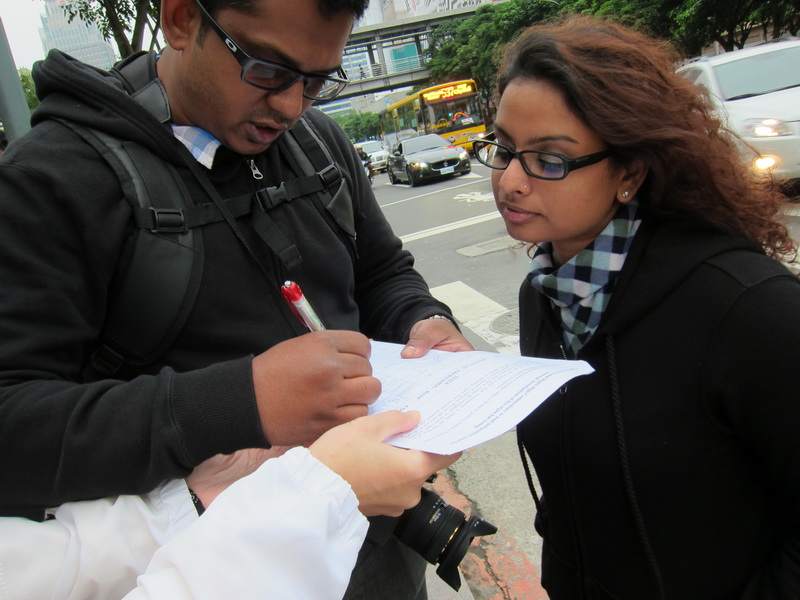 二位从巴西来的男孩只在台北逗留一天,明天就要离开,机缘巧合遇到征签,俩人都签名并且表示很愿意做这个要求制止迫害的签名。