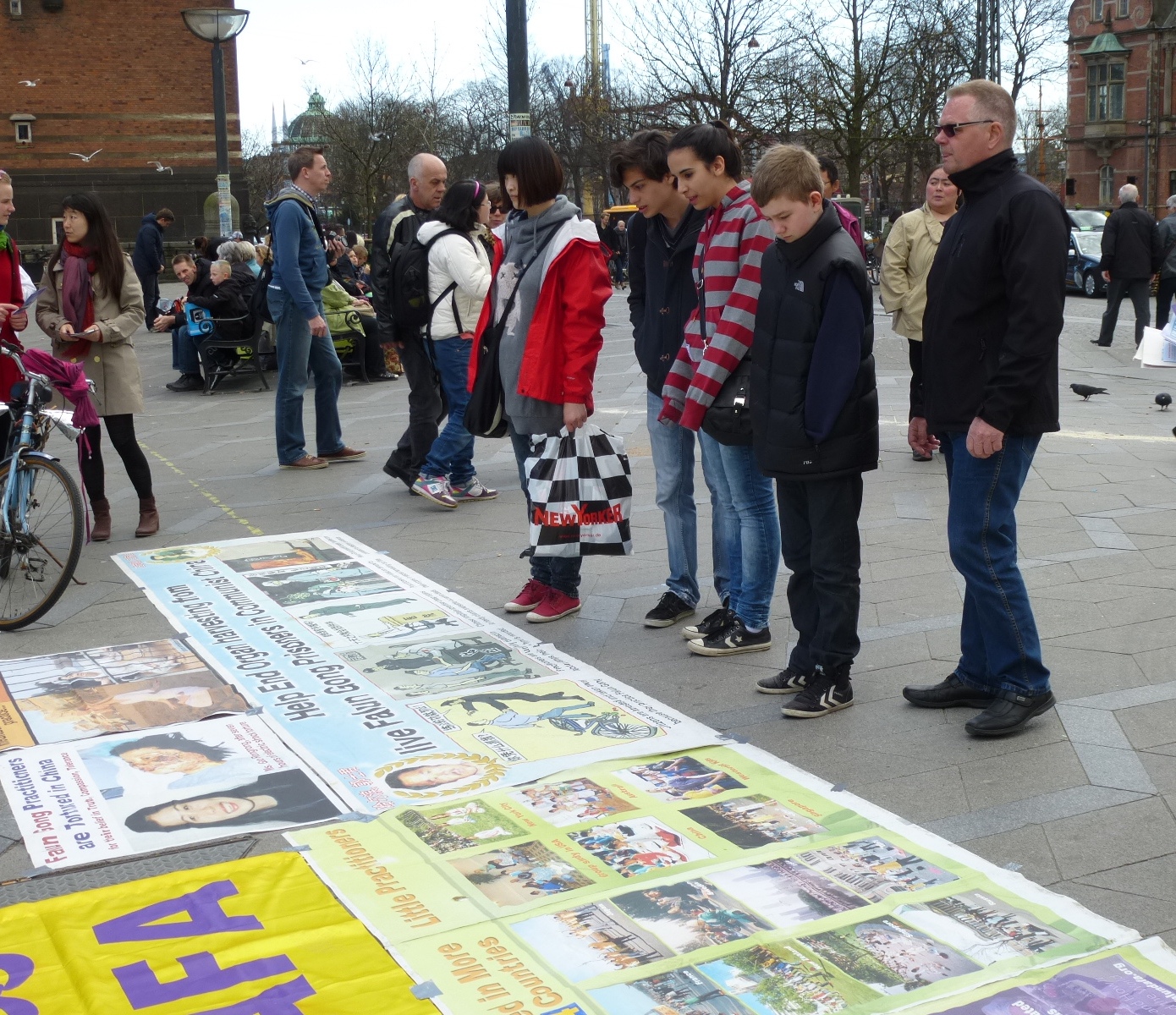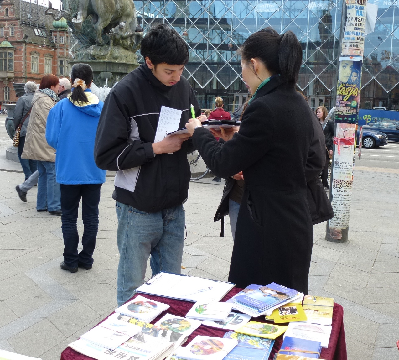 有一对青年学生路过学员展示的真相图片时,他们不由地驻足观看。 当看到法轮功学员被酷刑迫害以及他们的器官被活摘的图片时,其中的女学生表情非常震惊,她问学员:“难道这是真的吗?”当学员做出肯定的答复,并告诉她:“很多象你们一样善良的丹麦人很难想象这种非人的暴行,至今还在中国发生着。只因为法轮功学员不放弃自己对真、善、忍的信仰。这是我们这个星球上从未有过的罪恶,现在全世界有越来越多的人开始关注这件事情,必须马上制止迫害。”这位女学生感慨地说,她以前只知道中国没有人权,没有言论自由……但怎么也想象不到活体摘除器官的事!这时她旁边的男学生说:“我们生长在丹麦真是很幸运呵!我们很想帮助你们,请告诉我们可以做什么?”学员告诉他们,你们可以签名声援停止迫害,也请你们有机会把你们知道的真相告诉你们身边的每个人,让更多的人来关注声援,立即停止在中国对法轮功学员的迫害。两位学生很认真地签下了自己的名字,并说,他们会上网了解更多信息,相信迫害最终会被制止。