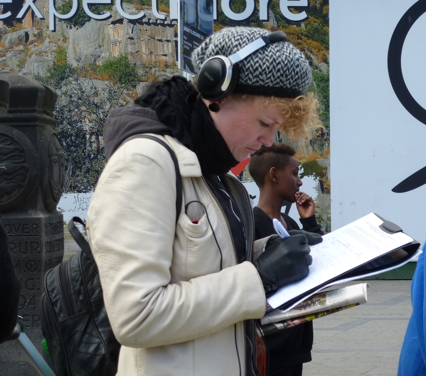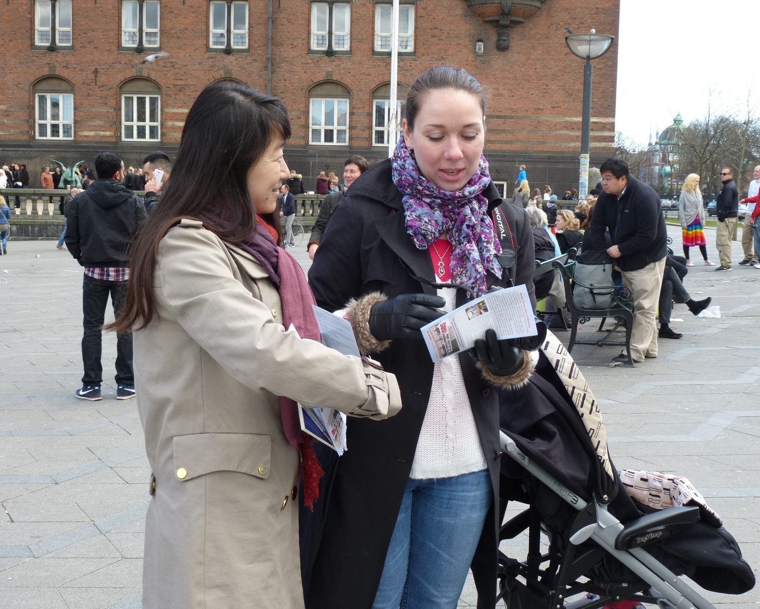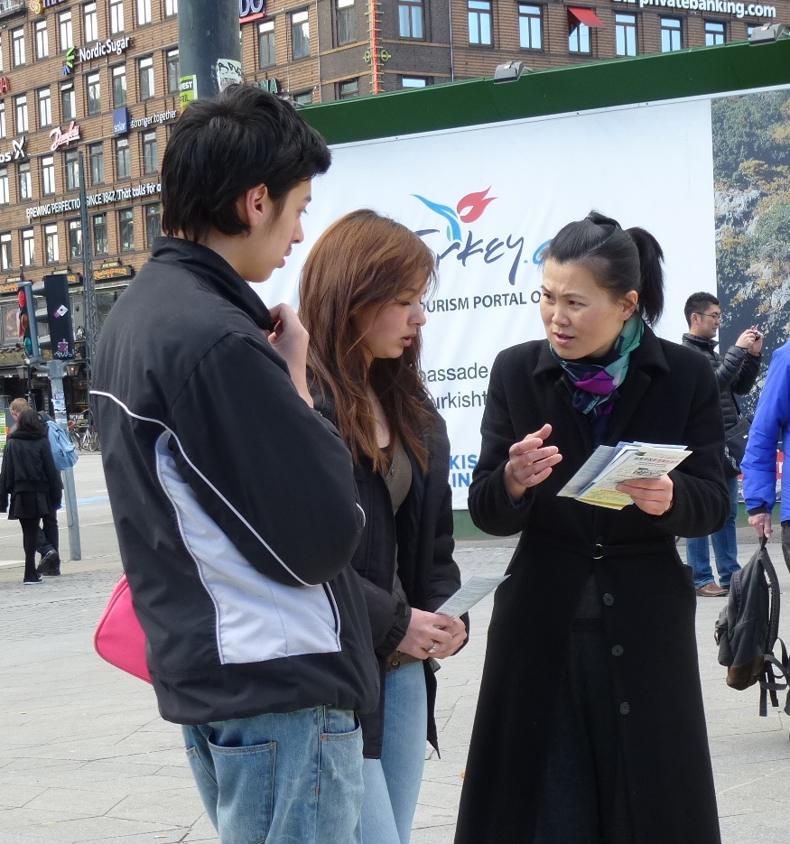 一位穿着时尚的女青年, 遇见了一位丹麦语说的并不怎么流利的中国学员。她停下脚步非常耐心地听这位学员给她讲真相,后来她说,她来自丹麦的第二大城市奥胡斯,她在学校里曾经听说过法轮功的事,也非常同情。最后她认真地在有关制止活摘器官的征签表上签下了自己的名字。