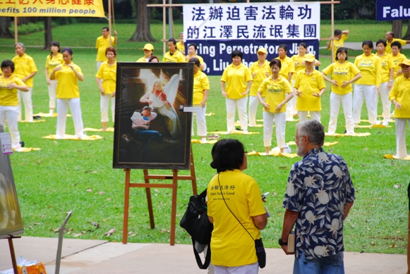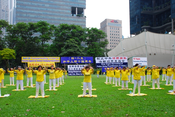 ![]() 纪念“四•二五”,新加坡法轮功传播真相。图为集体炼功。 |