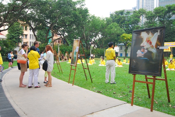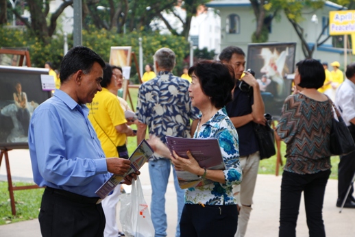 两位新加坡当地的年轻人停留了很久,向法轮功学员询问了很多问题。他们说:“这是第一次听到迫害这样的事情,心里十分震惊。”他们表示会让家人和朋友也来了解法轮功真相。