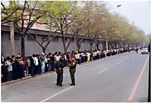 不大工夫,张亦洁就赶到中南海。“只见两旁人行道上学员肩并肩地排成望不到头的长龙,多数学员站着看书,坐在地上的或学法,或静静打坐炼功。穿着制服的警察很悠闲,有的与学员搭话,有的在相互聊天。整个现场看上去秩序井然,静得没有一点骚动。”