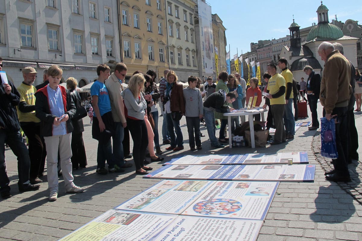 ![]() 克拉科夫古城广场游人观看法轮功真相展板 |