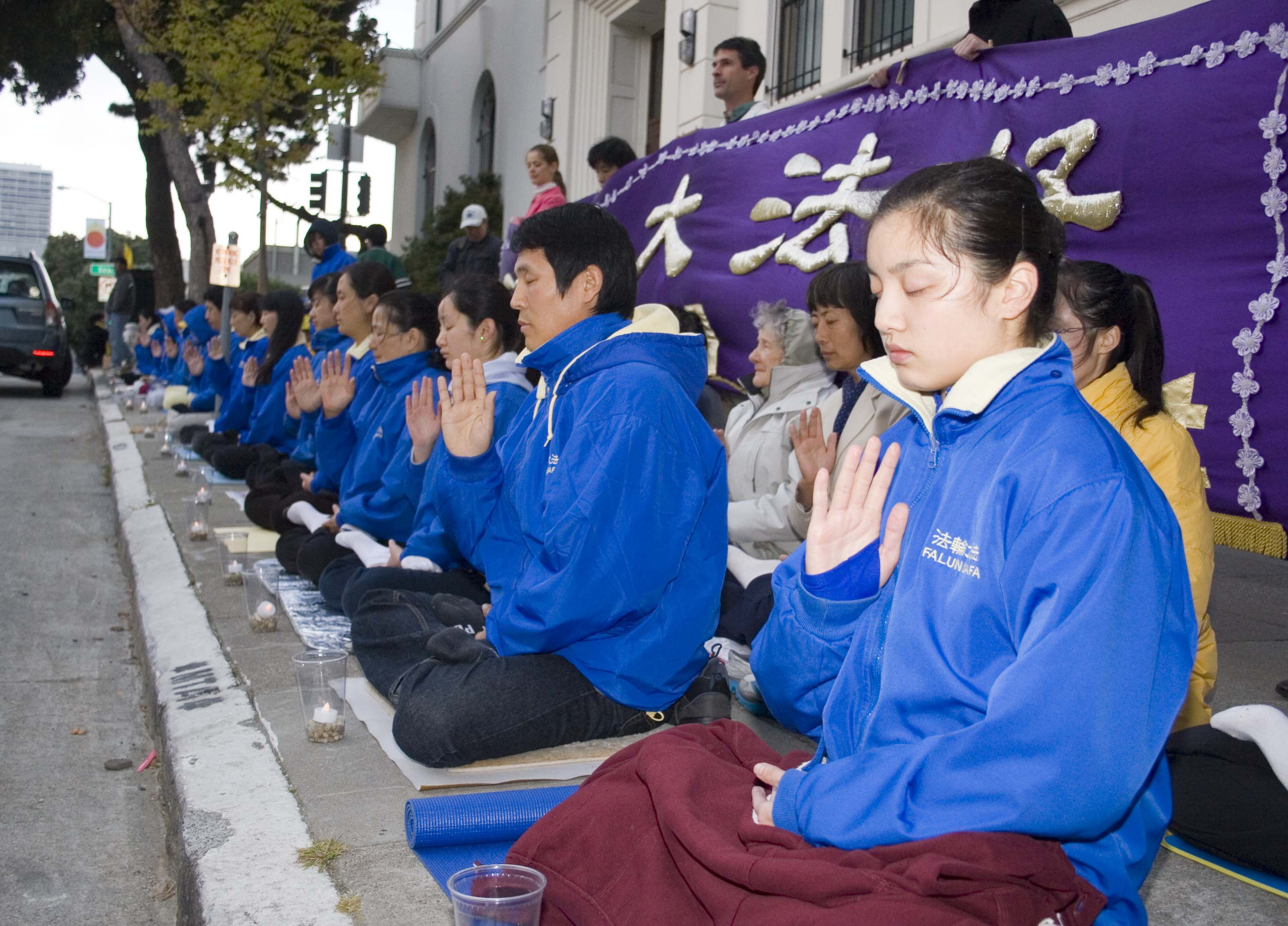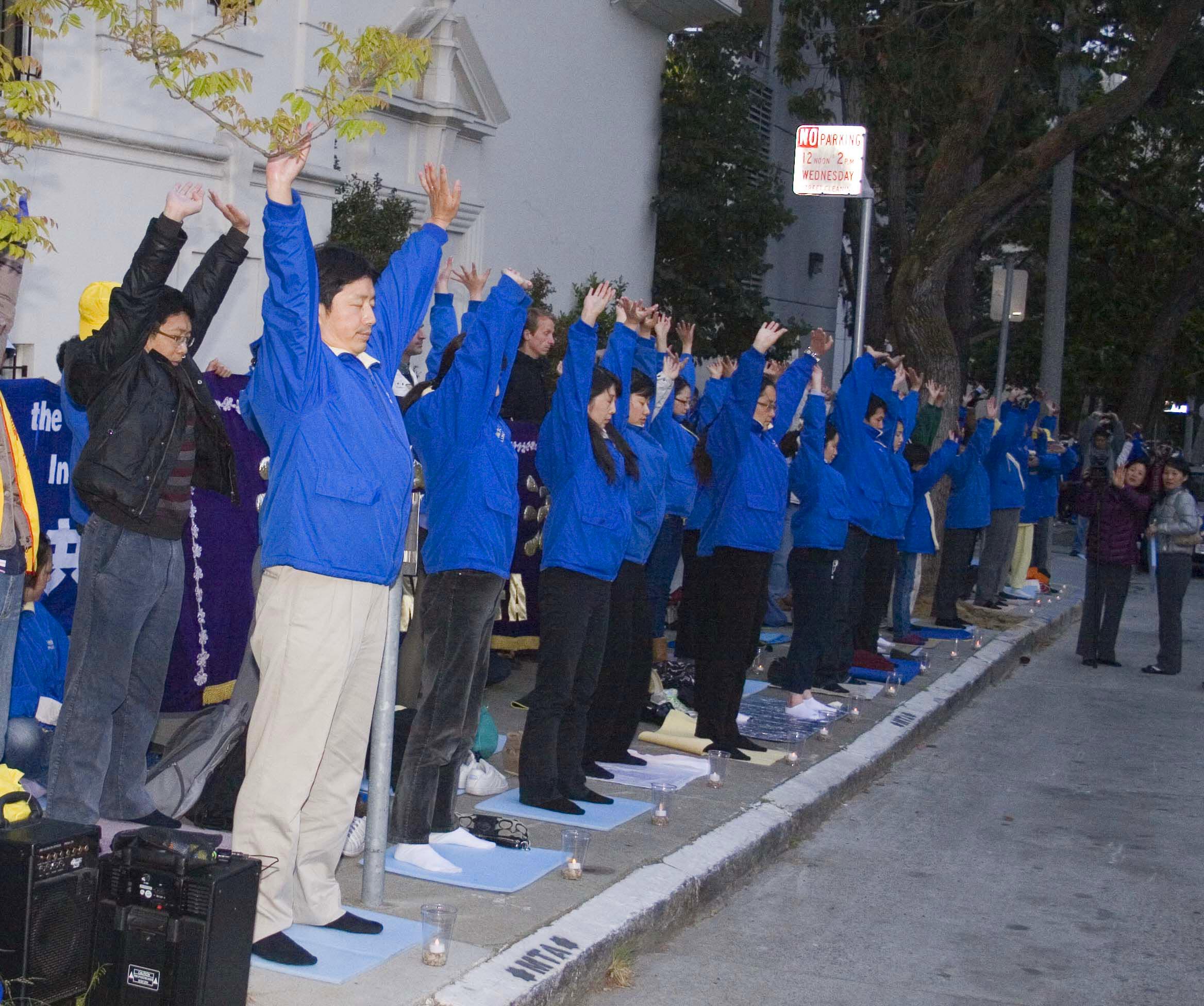 当晚,法轮功学员来到中领馆前点燃烛光,并集体炼功,打出“法轮大法好”、“解体中共,制止迫害”等横幅。现场不断有路人询问法轮功真相,还有特地赶来声援法轮功的民众。