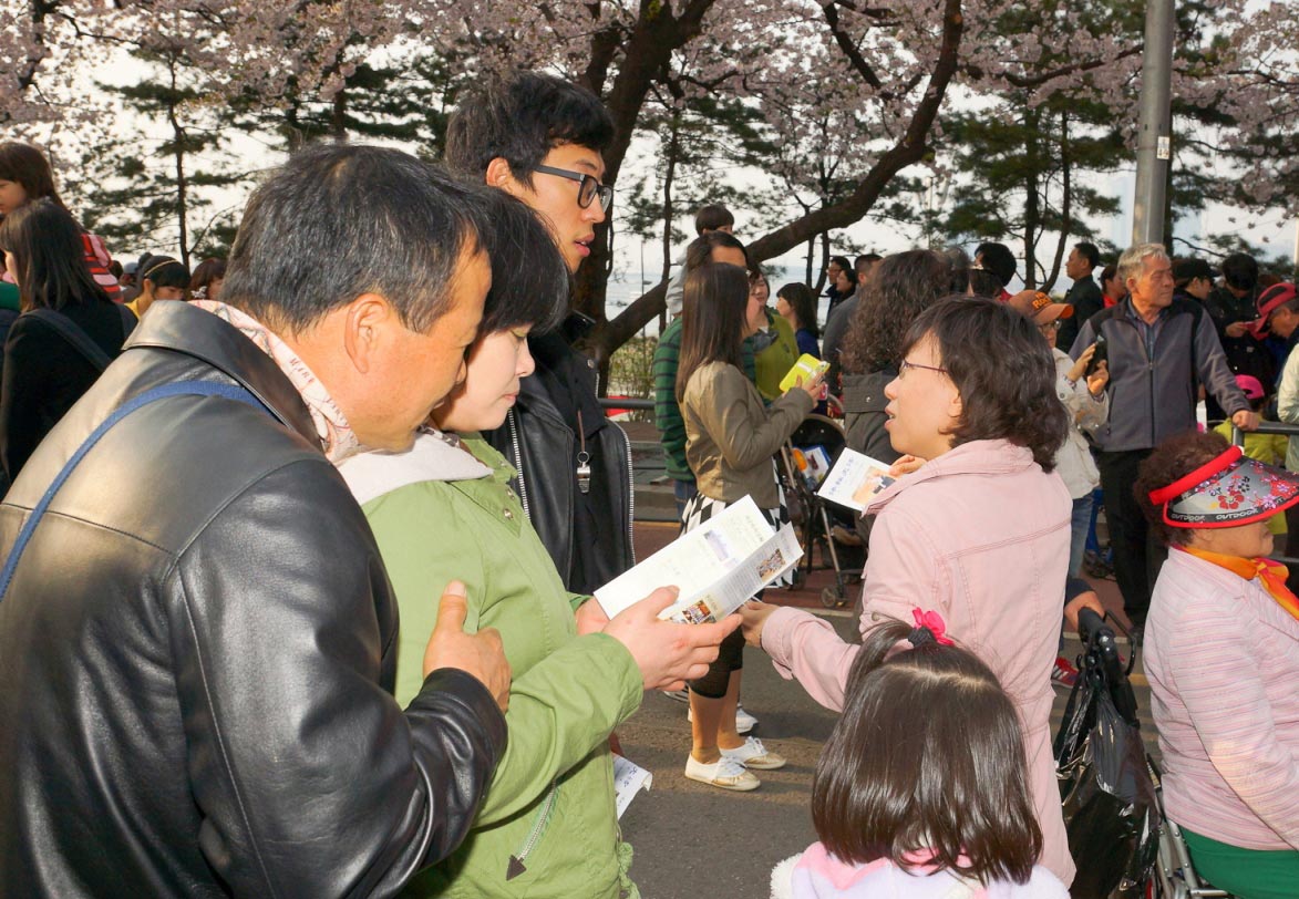 ![]() 来观赏春花的游客们,接过传单在认真阅读 |