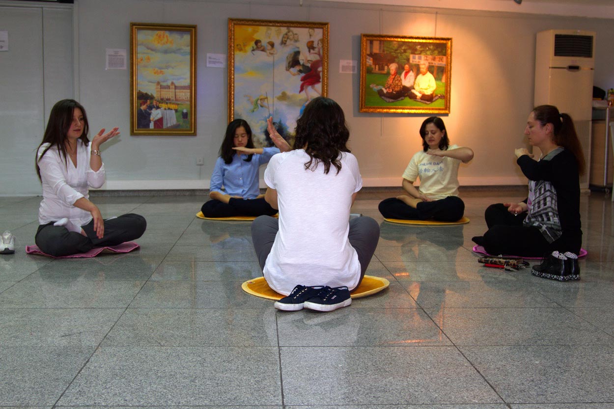 ![]() 画展每天午后一至二点之间,学员们轮流演示法轮功的五套功法,很多参观者当场学功。图中,两位参观者(右一、右三)在学炼第五套功法 |