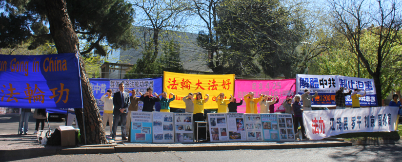 法轮功学员在现场展开“法轮大法好”、“四•二五和平上访十四周年”、“停止迫害法轮功学员”等大型横幅,前面摆放着一排揭露中共对法轮功学员实施酷刑迫害的真相展板。学员们向路人分发真相传单,讲述法轮功学员在中国遭受酷刑虐待和被活摘器官的真相并征集反迫害签名;另一些学员在悠扬的炼功音乐声中向世人展示法轮功五套优美祥和的功法。