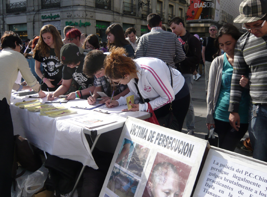 下午五点半到八点半,法轮功学员在马德里市中心太阳门广场集会,继续向世人揭露中共迫害法轮功、活摘法轮功学员器官的滔天罪行。人们了解真相后,纷纷前来签字声援法轮功反迫害。
