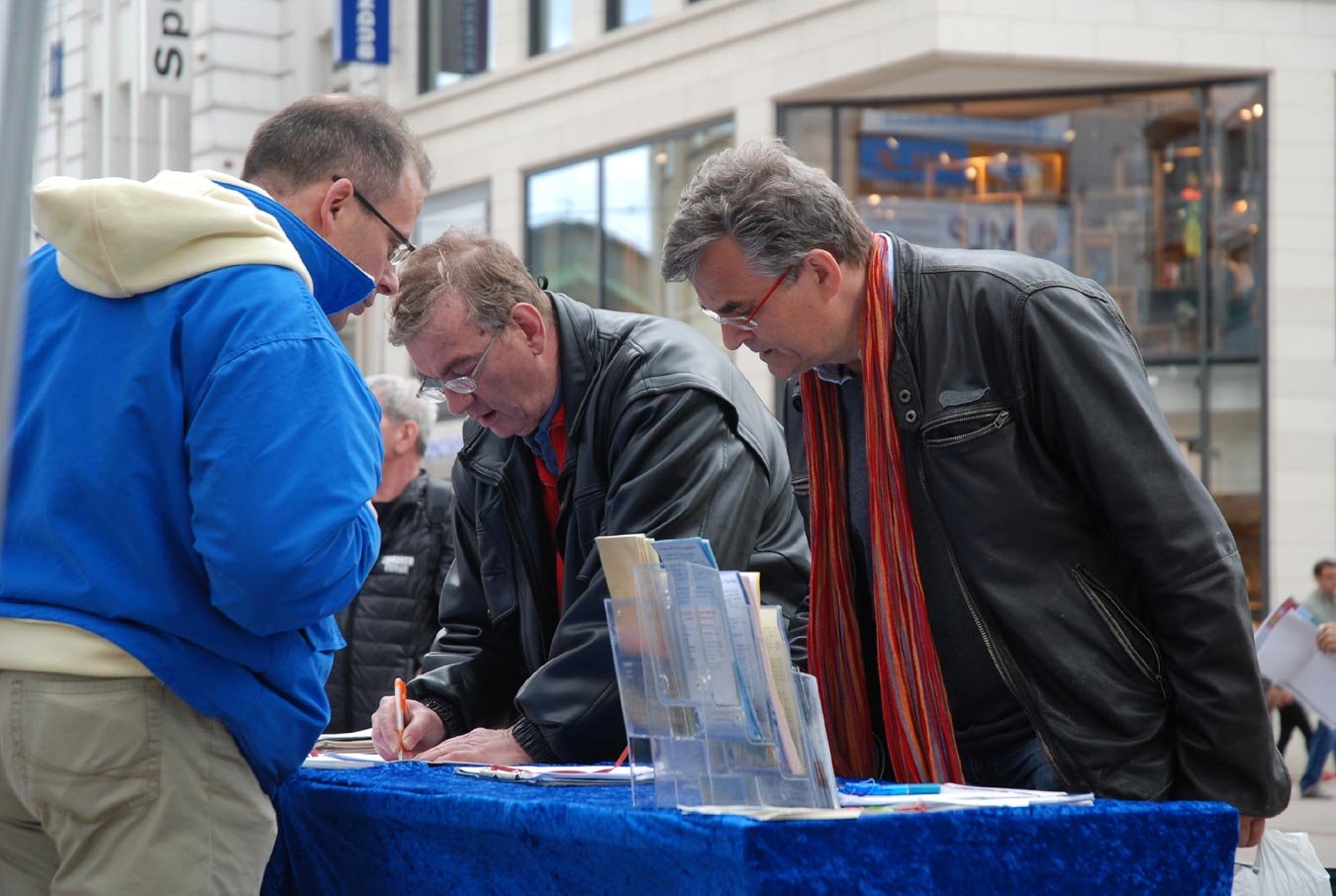 两位打扮得体颇有教养的中年女士路过,马上停住了脚步,一边倾听着真相录音,一边看着眼前的一切,脸上满是关注。得悉真相后,两人二话不说就掏出钱要捐款支持,而知道法轮功不接受捐款后,她们毫不犹豫地走到展位前,在反迫害和反活摘器官表格上签上了自己的名字。之后她们和学员倾谈了许久,你一言我一语地表示,虽然对前东德的所作所为已颇有了解,没想到中共更坏,酷刑迫害和活摘器官的残酷令人无法想象。