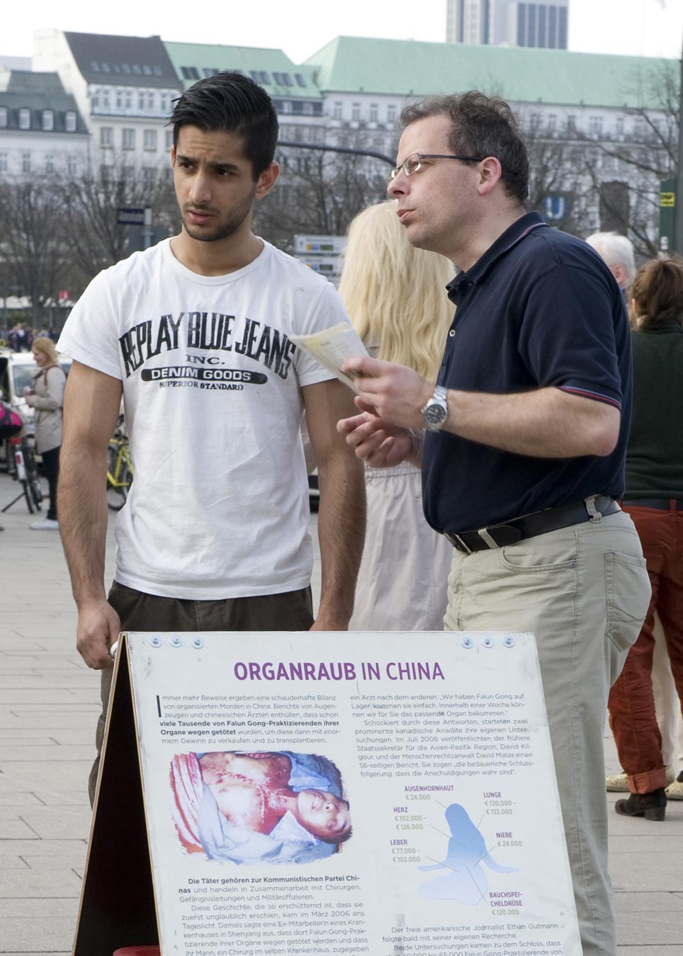 一位四十左右的男子仔细倾听活摘器官的事件后,对法轮功本身是什么流露出很大的兴趣。他说:“你们在这里做这些事,真是太好了。谢谢。”