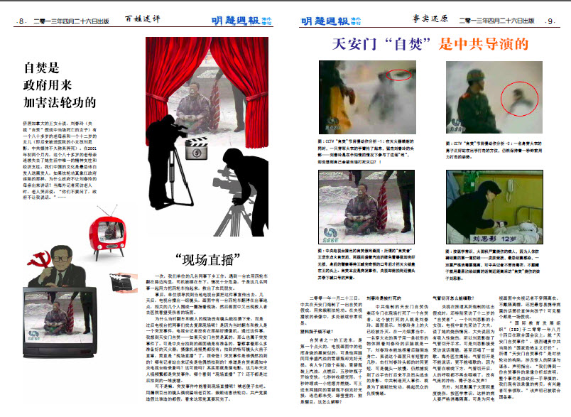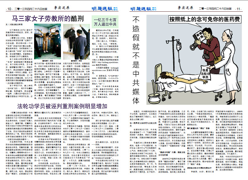 【明慧网二零一三年四月二十八日】明慧周报隶属于法轮大法明慧网,取材于明慧网,旨在帮助社会各界了解法轮功真相,其中包括明慧网首发的法轮功学员在大陆被迫害的真相、法轮功修炼 真相,法轮功学员对“真善忍”的理解和实践,对宇宙、人生、人体、生命本质的看法和人生感悟等等。海外版为正常版,在中国大陆以外发行;大陆版鉴于中国大陆的迫害,暂时采用A4纸。