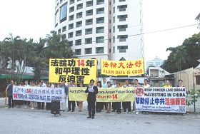 马国法轮功学员拉起反迫害的横幅,并以中文和马来文宣读当天纪念活动的宣言,介绍“4.25”法轮功万人上访事件的由来。两名法轮功的代表也向中共驻马使馆递交备忘录,抗议中共对法轮功十四年来的残酷迫害。