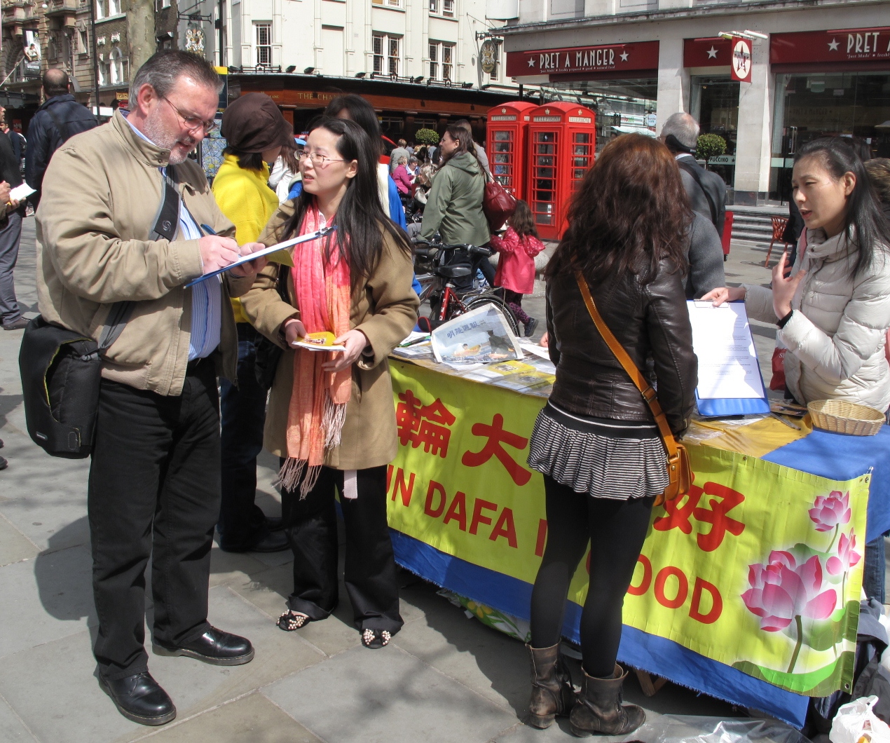 还有一些人主动要多张传单和资料去传给自己的亲朋好友,他们当中包括伦敦人罗杰。罗杰签字后问可不可以多要几张传单给朋友,他说自己以前就在经过圣马丁广场时见过法轮功学员,最近又看到英国媒体的一篇有关报道,他开始认真思考(中共)活摘法轮功学员器官这件事了,觉得“这太让人震惊了,必须让世界各国政府都知道,必须立刻停止。我希望我知道我能怎么帮点忙。”