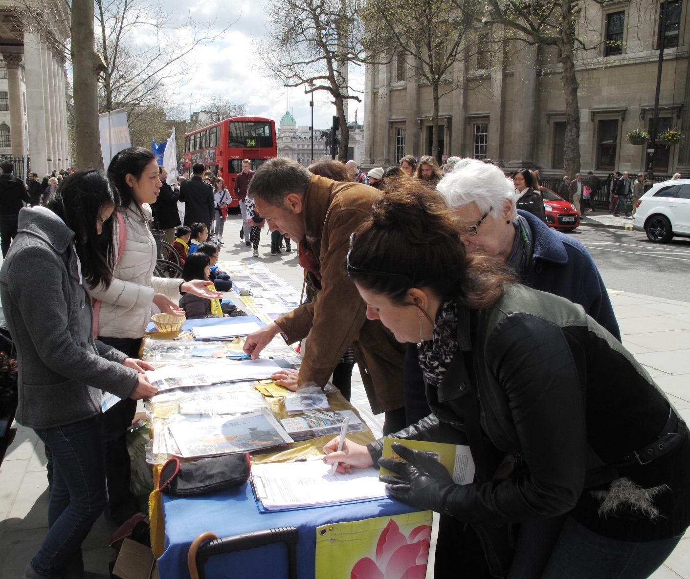 在一天的活动中,当天途经伦敦中心圣马丁广场的英国民众和来自世界各地的游客纷纷停下脚步认真了解法轮功真相,有许多民众驻足观看法轮功真相展板和信息,看到有关中共摘取法轮功学员器官这一罪恶的信息后,人们毫不犹豫地在要求呼吁联合国开展有关独立调查的征签表上签名,一天下来收集的签名约五百个。