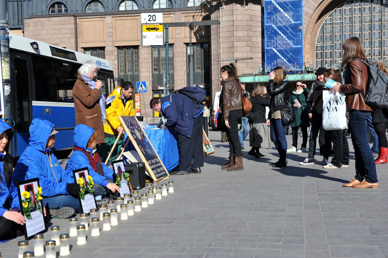 一位三十多岁的芬兰女士看到被迫害死的学员遗像时很惊讶,并表示不相信中共会做出这么残忍的事,然后她耐心地聆听一位曾在中国大陆亲身被中共政府非法关押于监狱,并曾遭到酷刑迫害的经历等。这位女士表示,一个政党竟然对一群善良的人残忍的迫害这么长时间,太可怕了,并马上在“反迫害征签表”上签名以示支持。烛光守夜过程,还发生很多感人的事。
