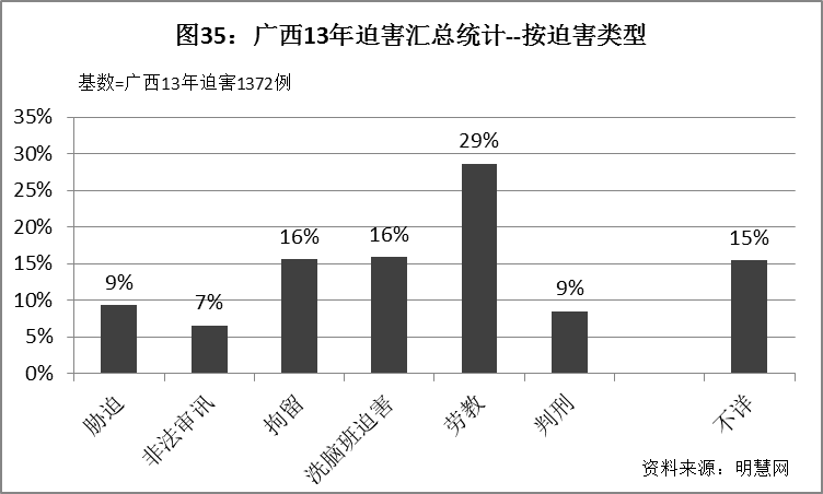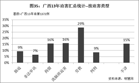 图35统计结果表明,13年迫害以来,29%的法轮功学员受到过“劳教”迫害,排第一,16%受到过“洗脑班迫害”和“拘留”迫害,排第二,9%曾经被判刑。可见,“劳教”作为中共独裁统治的“私生怪胎”,被广泛用来迫害法轮功学员,其次洗脑班这种中共当局专门针对“转化”法轮功学员而发明出来的新型迫害手段,也被广泛运用。