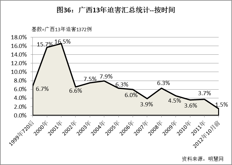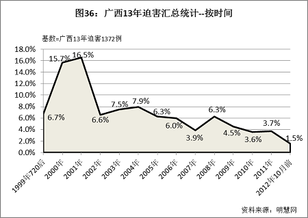 1999年7月20日到2012年10月底,我们通过明慧网共整理出1372例广西法轮功学员受迫害案例,发生在854名法轮功学员身上,平均每人受到1.6次迫害。本调查报告图1至图46统计数据,就是以这854名受迫害法轮功学员、1372例被迫害案例为统计基数而形成的。