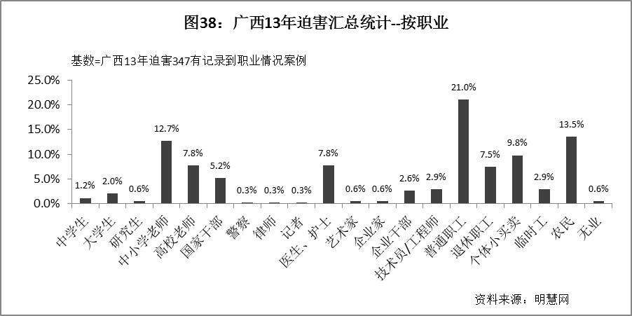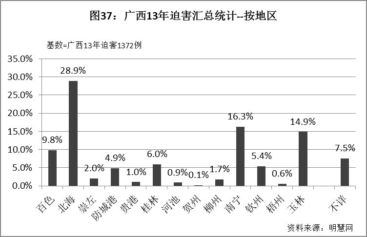 图37统计结果表明,广西13年迫害中,北海地区迫害案例最多,南宁地区排第二,玉林地区排第三,百色地区排第四。