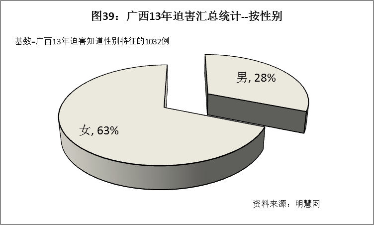 图39统计结果显示,在明慧网录得的这些迫害案例中,女性法轮功学员占63%。
