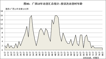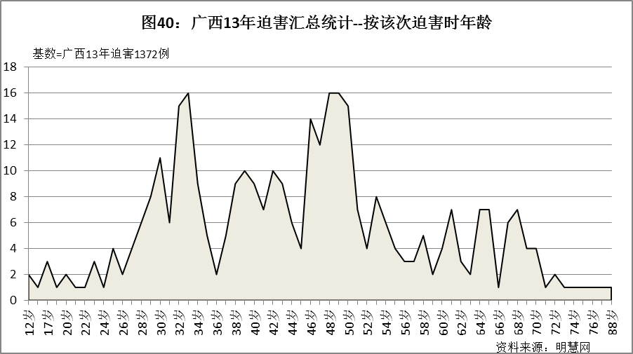 图40统计结果显示,在明慧网录得的这些迫害案例中,年龄最小的12岁,最大88岁。迫害主要集中在30岁到50岁这个年龄区间。其中,“32到33岁”,“46到50岁”是两个主要的受迫害年龄段。另外,30岁、39岁和42岁这三个年龄受迫害的比例也较高。