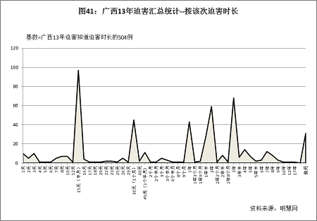 图41是法轮功学员每次受迫害时长的统计,结果表明,法轮功学员每次受迫害时长从1天到17年不等,并出现了非常明显的6个尖峰,15天(半个月)、30天(1个月)、1年、1年半和2年、3年,以及被迫害致死人数也是尖峰。