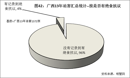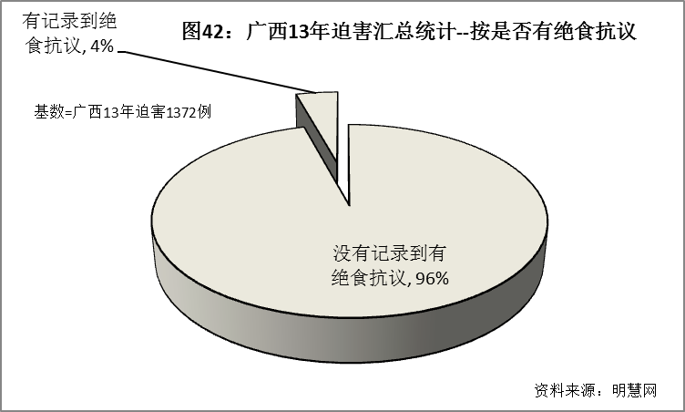 图42统计结果显示,在明慧网录得的1372例迫害案例中,有4%明确记录到“绝食抗议”。
