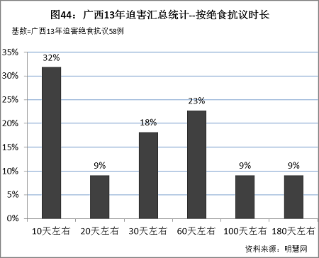 图44统计结果表明,在这些绝食抗议中,32%持续了10天左右,23%持续两个月60天左右,18%持续一个月30天左右,还有9%持续6个月180天左右。