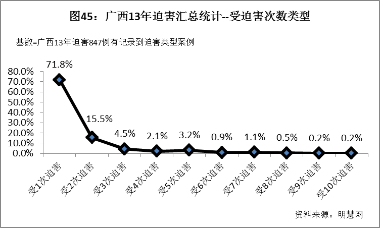 图45统计结果表明,包括胁迫、非法审讯、拘留、洗脑班、劳教、判刑,大多数法轮功学员受到过1次迫害,然后是2次迫害,也有受到9次、10次迫害的。